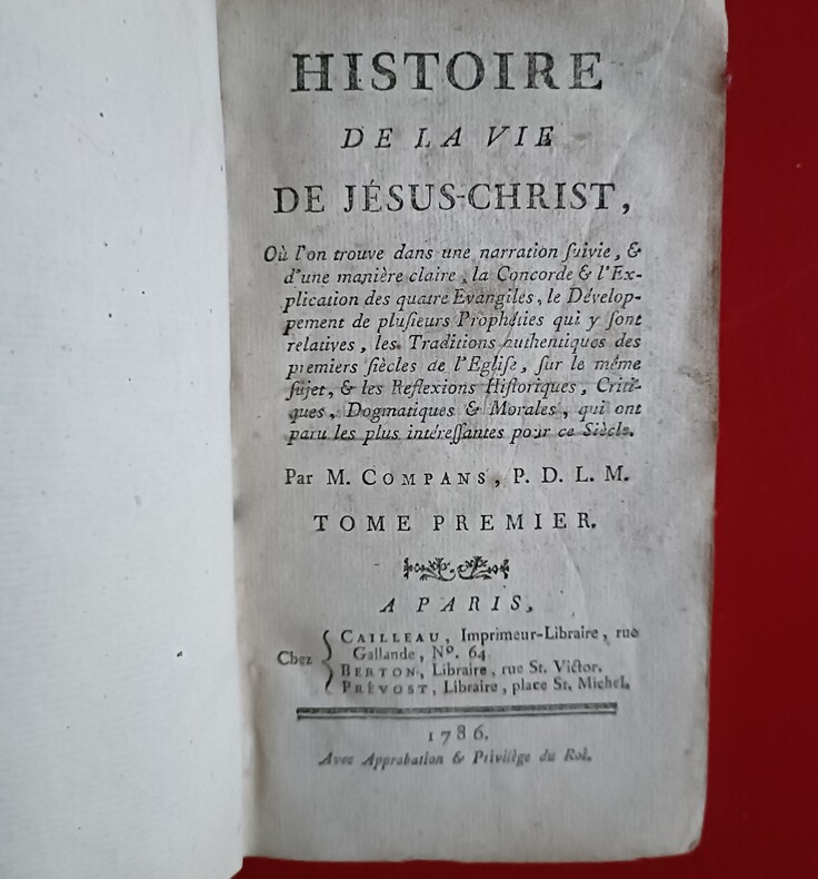 Où l'on trouve dans une narration suivie, et d'une manière claire, la Concorde et l'Explication des quatre évangiles, le Développement de plusieurs Prophéties qui y sont relatives, les Traditions authentiques des premiers siècles de l'église, sur le même sujet, et les Réflexions Historiques, Critiques, Dogmatiques et Morales, qui ont paru les plus intéressantes pour ce Siècle--Total de 568 pages-- Edité chez Cailleau imprimeur libraire en 1786--Etat pas trop mal pour un livre de cet âge là--Envoi en colissimo ou par mondial relay, moins de 500 gr