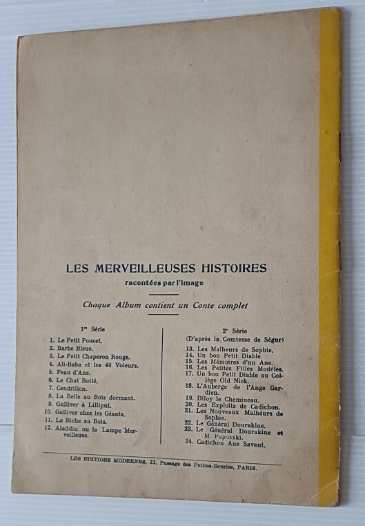 Chaque album de la collection "* Les Merveilleuses Histoires racontées par l'image" contient un conte complet--2e série - n° 17 - Total de 16 pages--Format : 19 cm 26.5 cm--Edité par les Editions Modernes sans date -- Les pages 5 à 12 sont détachées car les agrafes qui les retenaient ont rouillé -- 1 nom inscrit tout en haut de la page 1 - 1 petit accroc en bas à gauche car il y avait quelque chose de collé et en partant, il a enlevé la partie superficielle -- envoi en lettre suivie moins de 250 gr