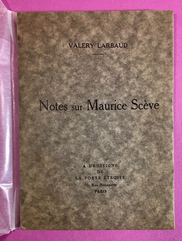 ed. À l’enseigne du la Porte etroite 1926 petit in-12 br., couv. rempliee, court mais tres beau texte à la gloire de M.S., «_De tous nos poetes meconnus, Sceve et le plus injustement meconnu [...] Les poetes français n’ont produit qu’un petit nombre de ces ouvrages vraiment sacres. J’ose dire que La Delie est un de ceux-là_», edition originale, ex. numerote sur velin d’Arches