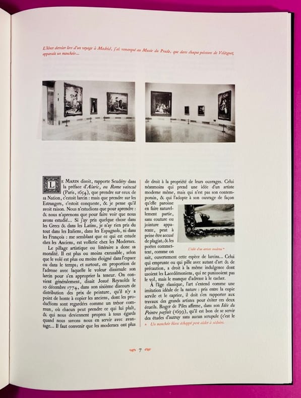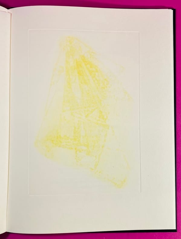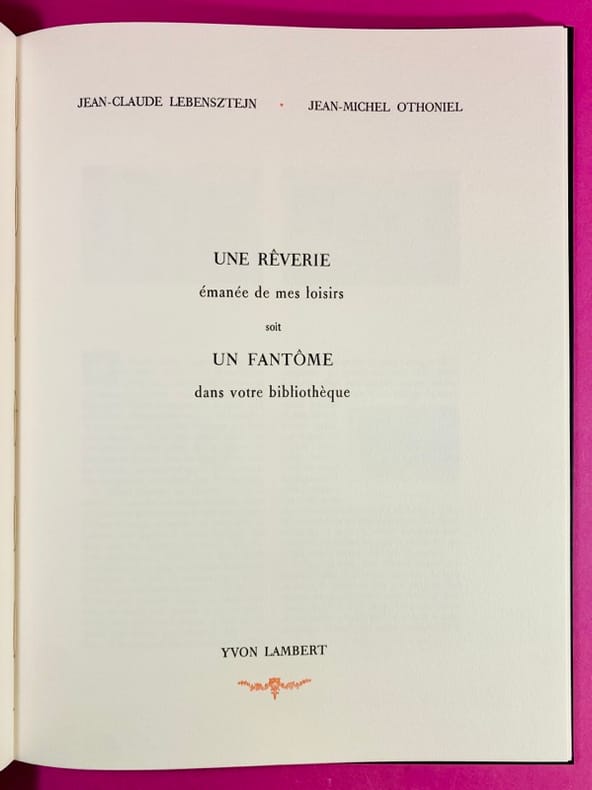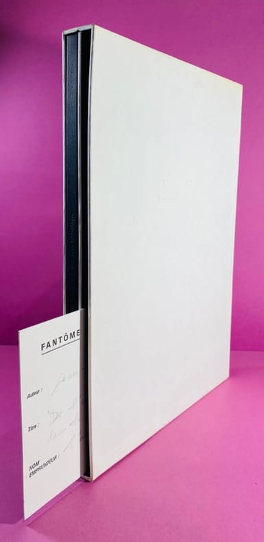 1994 Couverture rigide Paris, Yvon Lambert, 1994. Un volume in-4 (35 x 26 cm), cartonnage de l'éditeur avec titre estampé à froid au premier plat et au dos, coffret blanc avec quelques marques d'usage. 16 pages, 4 feuillets non chiffrés incluant une gravure au souffre et à l'huile d'olive, un "fantôme" cartonné à part fini à la main par Jean-Michel Othoniel. "Une rêverie de mes loisirs" de Jean-Claude Lebensztejn a été composée à la main par les typographes de l'atelier du livre en caractères Luce Corps 12 dits "saint Augustin" gravés pour Louis XV de 1740 à 1770. A partir de cette "Rêverie", Jean-Michel Othoniel a écrit les légendes et notules du livre absent "De l'importance du mouchoir dans la peinture de Velazquez", composées en caractères Grandjean italiques corps 8 et 10 dits "Romains du Roi" gravés pour Louis XIV de 1693 à 1745. Ces textes imprimés en noir et rouge sur Velin Rives 180g accompagnent : 20 images en noir et blanc de peintures espagnoles photographiées par l'artiste au musée du Prado, reproduites en phototypie sur chromolux 80g et mises en page par l'artiste, une gravure au soufre et à l'huile d'olive sous serpente tirée en jaune sur Velin Rives 180g. Le fantôme cartonné est composé en Univers Romain corps 14 tiré sur Lanaquarelle 640g avec mentions manuscrites à la mine de plomb de Jean-Michel Othoniel. Le tout constitue l'édition complète. Tirage à 150 exemplaires, le nôtre un des 10 exemplaires d'artiste marqué EAF, signé par l'artiste et l'auteur. Envoi de Jean-Michel Othoniel à la mine de plomb daté du 8 décembre 1994. Bon exemplaire de cette édition originale.
