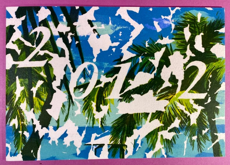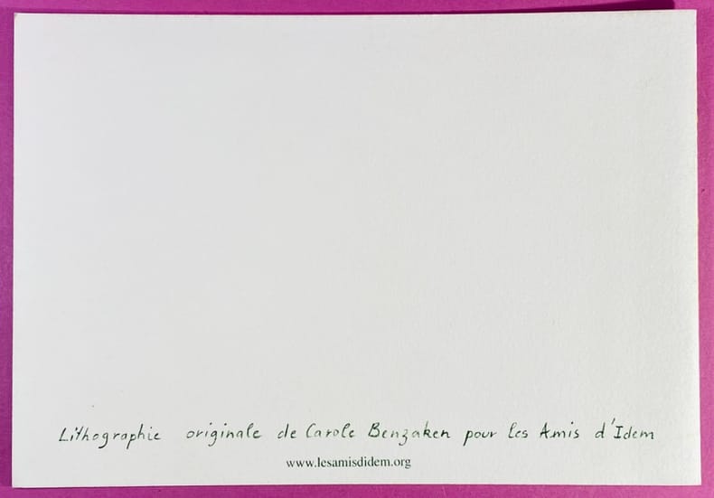 2012 couverture souple Paris, les amis d'Idem, 2012. Carte de voeux dépliante sur papier fort de format in-12 oblong (15 x 21 cm), lithographie originale en couleurs de l'artiste. Carole Benzaken est une artiste peintre et graveuse contemporaine, née en 1964 à Grenoble. Lithographie tirée à l'atelier Idem, célèbre imprimerie d'art dans le quartier Montparnasse à Paris. Mention manuscrite à l'intérieur du carton Lithographie originale en très bon état.