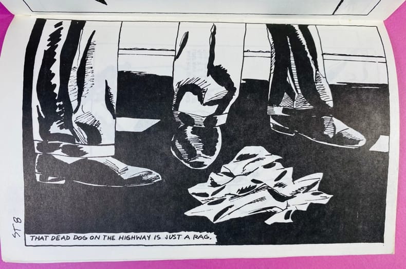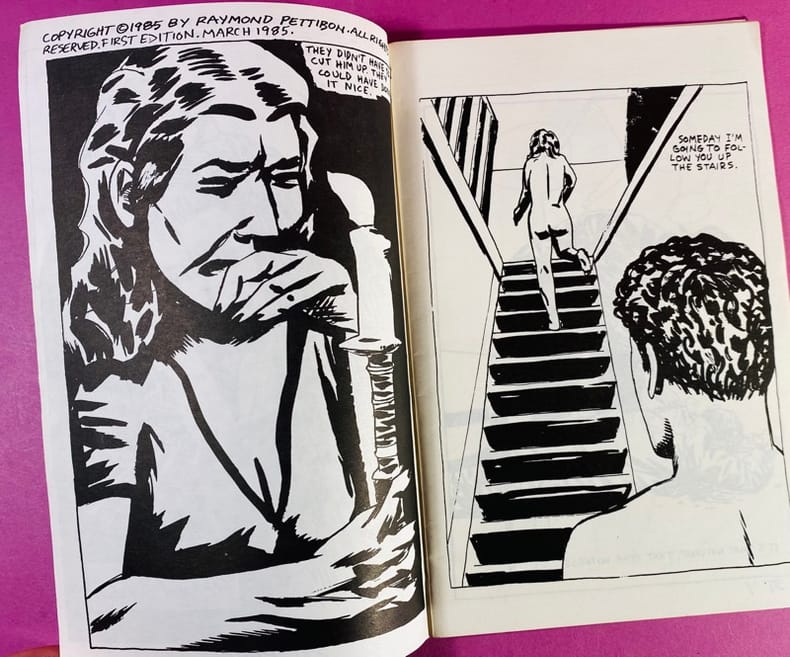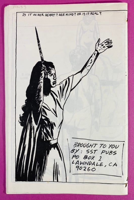 1985 Lawndale, SST pubs, 1985. Une brochure agrafée in-8 (21,6 x 14 cm), couverture illustrée. 28 pages non chiffrées, illustrées de reproductions de dessins en noir de l'artiste, petite marque de rouille marginale au niveau de l'agrafe supérieure sur quelques feuillets. Texte en anglais. Répertorié n°33 dans le catalogue raisonné de Koch et Ohrt, consacré à l'oeuvre de Pettibon. Tirage à 500 exemplaires, non numéroté. Né à Tucson en 1957, Raymond Pettibon s'est fait connaître au début des années 1980 sur la scène punk rock du sud de la Californie, en créant des affiches et des pochettes d'album principalement pour le label SST Records. Illustrés de dessins au trait épais dans le style des "comic books" américains et accompagnés de textes dérangeants, ironiques ou ambigus, ses fanzines sont appréciés pour leur esthétique brute et leur capacité à capturer l'énergie et l'esprit de la culture punk et du "DIY (Do It Yourself)". Figure de la culture underground, Pettibon sera par la suite plus largement reconnu pour son influence sur la scène artistique contemporaine. Très bon état intérieur, bon exemplaire de cette édition originale.