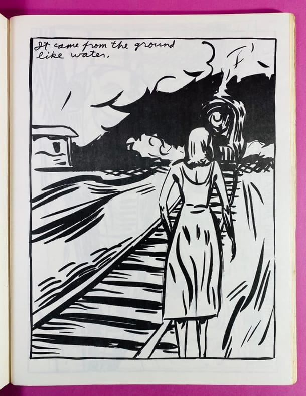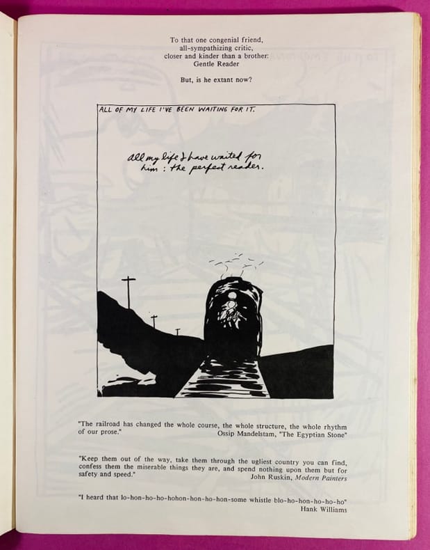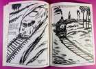 1988 Beverly Hills, Illiterati Press, 1988. Une brochure agrafée in-4 (28 x 22 cm), couverture illustrée, couverture passée avec quelques marques, petit manque au coin inférieur du verso de la couverture (voir photo). 76 pages non chiffrées, illustrées de reproductions de dessins en noir de l'artiste sur le thème du train. Texte en anglais. Né à Tucson en 1957, Raymond Pettibon s'est fait connaître au début des années 1980 sur la scène punk rock du sud de la Californie, en créant des affiches et des pochettes d'album principalement pour le label SST Records. Illustrés de dessins au trait épais dans le style des "comic books" américains et accompagnés de textes dérangeants, ironiques ou ambigus, ses fanzines sont appréciés pour leur esthétique brute et leur capacité à capturer l'énergie et l'esprit de la culture punk et du "DIY (Do It Yourself)". Figure de la culture underground, Pettibon sera par la suite plus largement reconnu pour son influence sur la scène artistique contemporaine. Très bon état intérieur, bon exemplaire de cette édition originale.