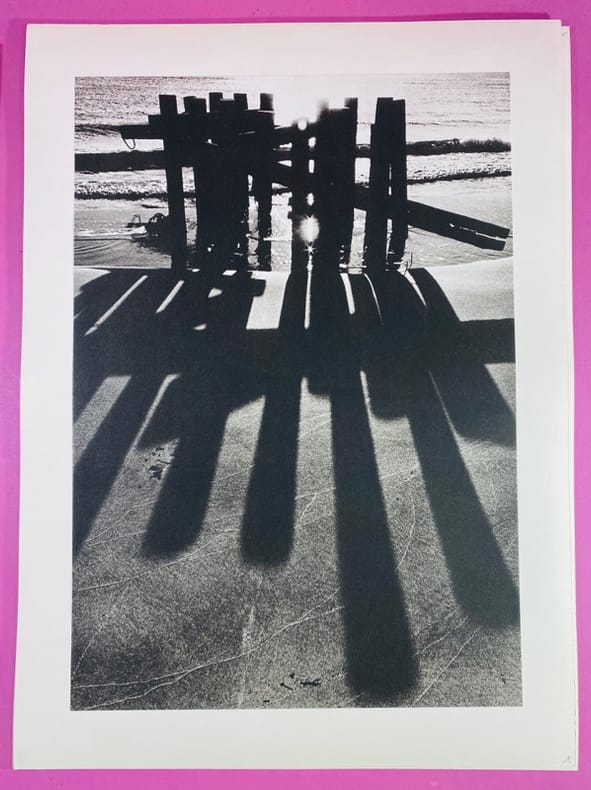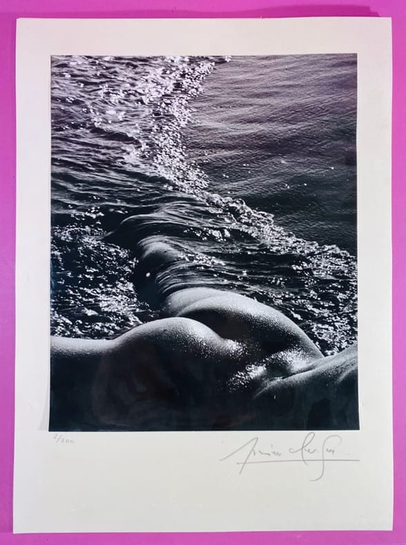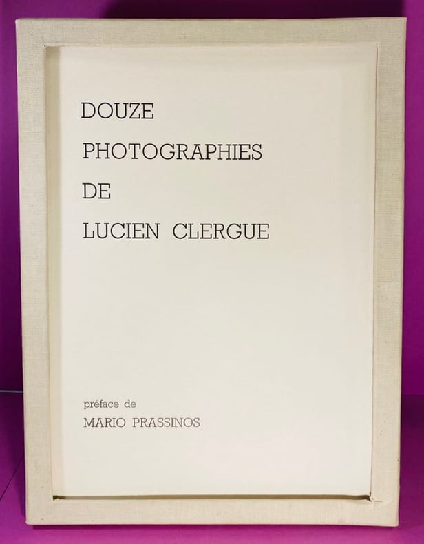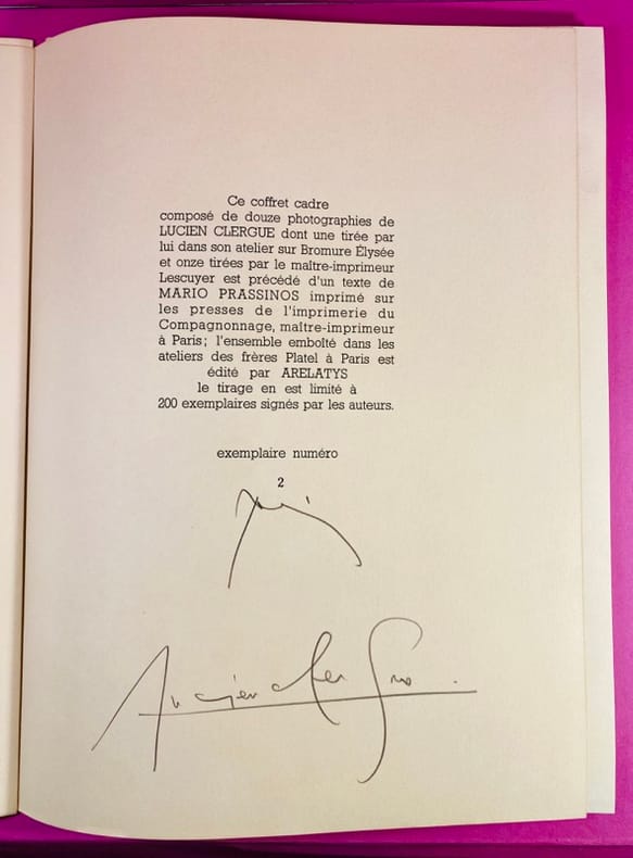 1970 Couverture rigide Paris, Arelatys, 1970.In-folio (42 x 32 cm) en feuilles, sous coffret entoilé beige, couvercle supérieur amovible, quelques marques marginales au dos du coffret et petit accroc au coin inférieur du couvercle amovible. 6 feuillets non chiffrés de texte comprenant la préface de Mario Prassinos et la justification du tirage, signée et numérotée par les auteurs, suivis : d'une épreuve originale argentique (30 x 24 cm) tirée par l'artiste sur papier bromure, "Nu de la mer", signée et numérotée par Lucien Clergue à la mine de plomb, et de 11 héliogravures représentant des paysages de la Camargue. Toutes les photographies sont montées sur papier fort. Coffret tiré à 200 exemplaires signés et numérotés, le nôtre portant le n°2. Au carrefour des années 60 et 70, Lucien Clergue est alors au sommet de sa carrière, reconnu pour ses nus photographiés en pleine nature, ses images de la Camargue, et ses collaborations avec des artistes majeurs comme Picasso et Cocteau. Cette période marque aussi son intérêt croissant pour l'expérimentation technique et la collaboration avec des écrivains et poètes, comme c'est le cas ici avec Mario Prassinos, poète et peintre grec. Les douze photographies présentes dans ce coffret reflètent parfaitement les thèmes de prédilection de Clergue : le nu féminin, la mer, la lumière méditerranéenne, la Camargue... Bel état des tirages, bon exemplaire de cette édition originale.