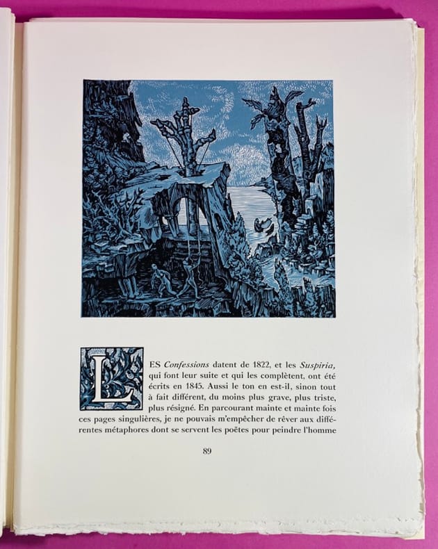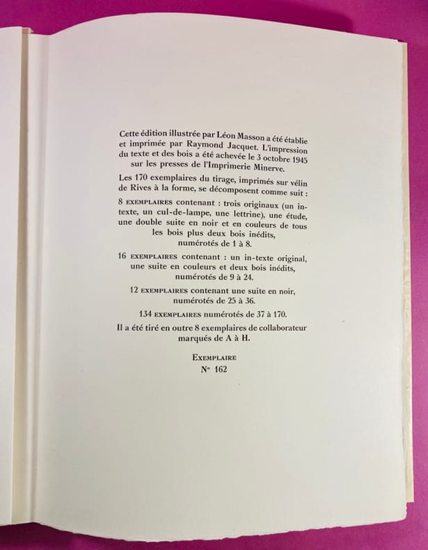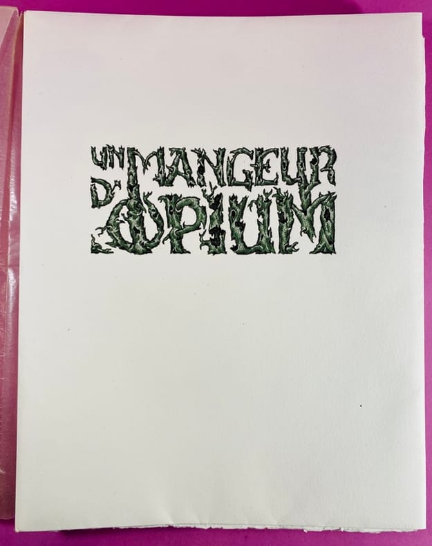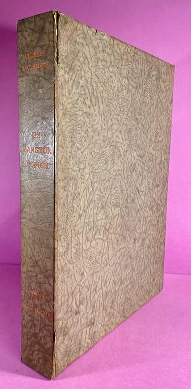 1945 Couverture souple Paris, La Mandragore, 1945. Un volume in-4 (33,5 x 26 cm), en feuilles sous chemise titrée et rempliée, dans son emboîtage, quelques accrocs à l'emboîtage. 124 (3) pages, illustrées de compositions en couleurs de Léon Masson. Tirage à 170 exemplaires, le nôtre un des 134 exemplaires sur vélin de Rives à la forme (n°162). Dans ce texte extrait des "paradis artificiels", Baudelaire dépeint l'opium comme une porte vers un monde onirique et décadent, mais aussi comme un miroir des abîmes de l'âme, entre extase et désespoir. L'ouvrage s'inscrit dans la tradition du romantisme noir et annonce les thèmes de la modernité littéraire. Bel état des planches et du texte, bon exemplaire de édition illustrée.