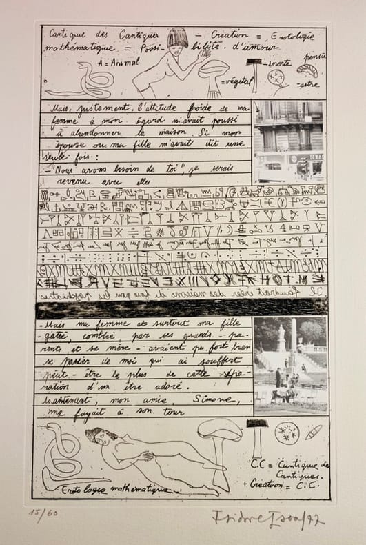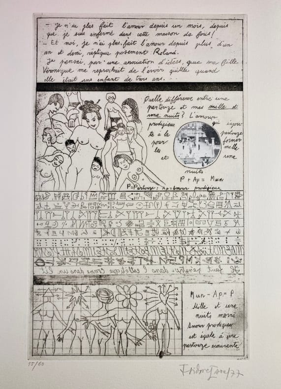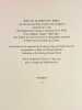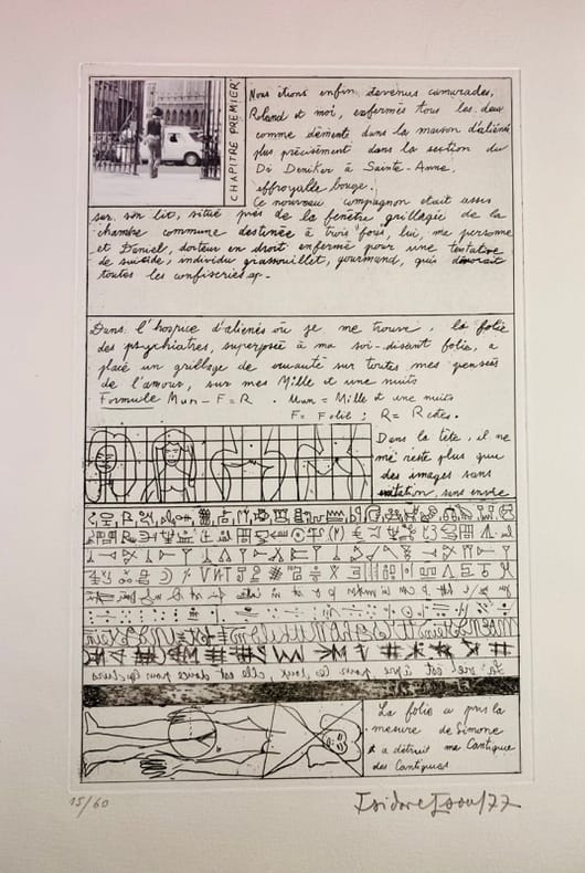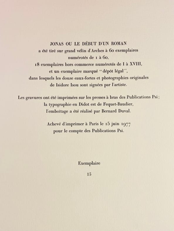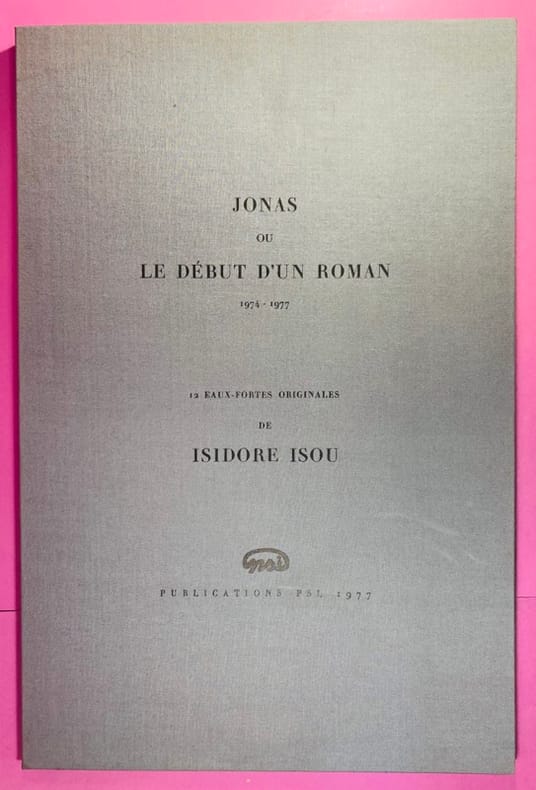 1977 Couverture souple Paris, Publications PSI, 1977. Un volume in folio (50 x 32,5 cm), en feuilles sous un portfolio de l'éditeur titré et entoilé, portfolio à rabats, quelques marques fines et marginales au portfolio. Feuillet de titre, 12 eaux-fortes originales de l'artiste sous serpente, toutes justifiées et signées par l'artiste à la mine de plomb, feuillet de justification du tirage. Tirage à 78 exemplaires, le nôtre un des 60 exemplaires numérotés sur grand vélin d'Arches. Les gravures ont été imprimées sur les presses à bras des publications Psi, la typographie en Didot est de Fequet-Baudier, l'emboîtage a été réalisé par Bernard Duval. Achevé d'imprimer le 15 juin 1977. Isidore Isou est le fondateur (avec Gabriel Pomerand) du lettrisme, mouvement qui repose sur l'idée de dépasser les formes traditionnelles de l'art en utilisant les lettres, les signes et les sons comme matériaux de base, plutôt que les mots ou images conventionnelles. "Jonas ou le début d'un roman" s'inscrit dans la série des "romans hypergraphiques" d'Isou, qui repoussent les limites du roman traditionnel en associant gravure, dessin, photographie et texte. Ce titre a été exposé dans le cadre de rétrospectives consacrées à Isou, notamment à l'Institut culturel roumain de Stockholm en 2012. Bel état des planches, bel exemplaire.