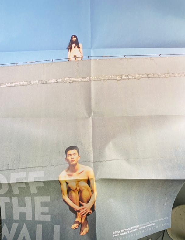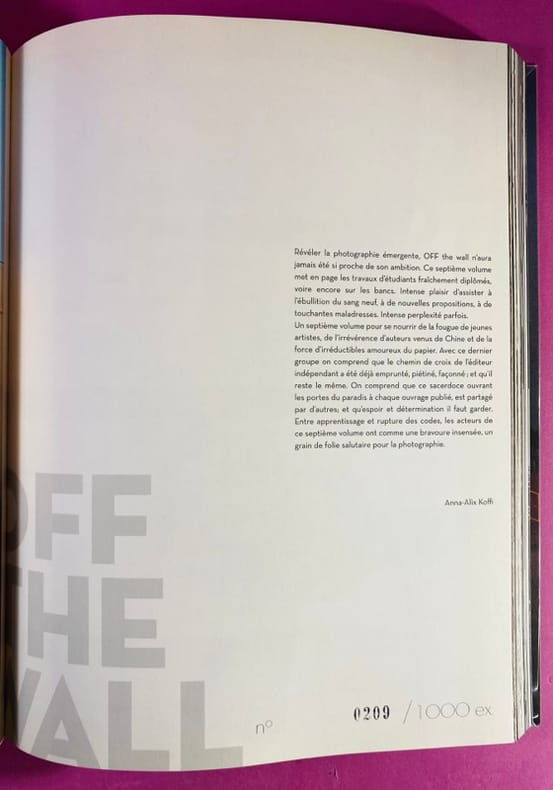 Couverture souple Paris, Off society, sans date [2015]. Un volume in-4 broché (30 x 23 cm), couverture illustrée d'une phtographie de Ren Hang, titre argenté au premier plat, plastique de protection. Nombreuses reproductions photographiques en noir et en couleurs, accompagnées de textes en français (analyses, interviews...). Tirage limité à 1000 exemplaires numérotés. Off the wall est une publication consacrée aux artistes photographes émergents, limitée à 10 numéros. Dans celui-ci, le numéro 7, sont présents notamment Ren Hang, Mo Yi, Isi Veleris, Li Wei, Sanja Llic, Benjamin Mouly... On trouve également un hommage à Lucien Clergue, et un interview de Claude Nori, fondateur des éditions Contrejour. Exemplaire comprenant un poster dépliant de Ren Hang en feuillet libre (60 x 80 cm). Bel exemplaire, comme neuf.