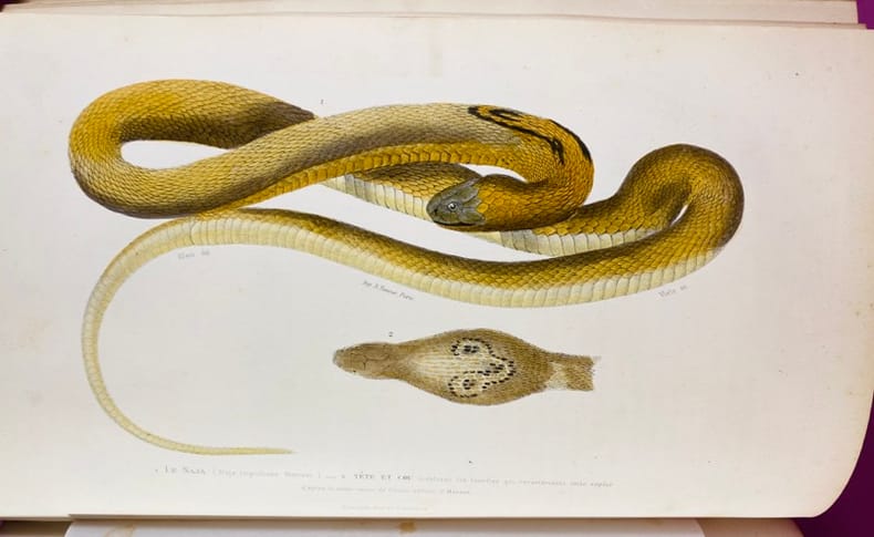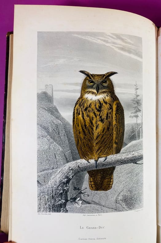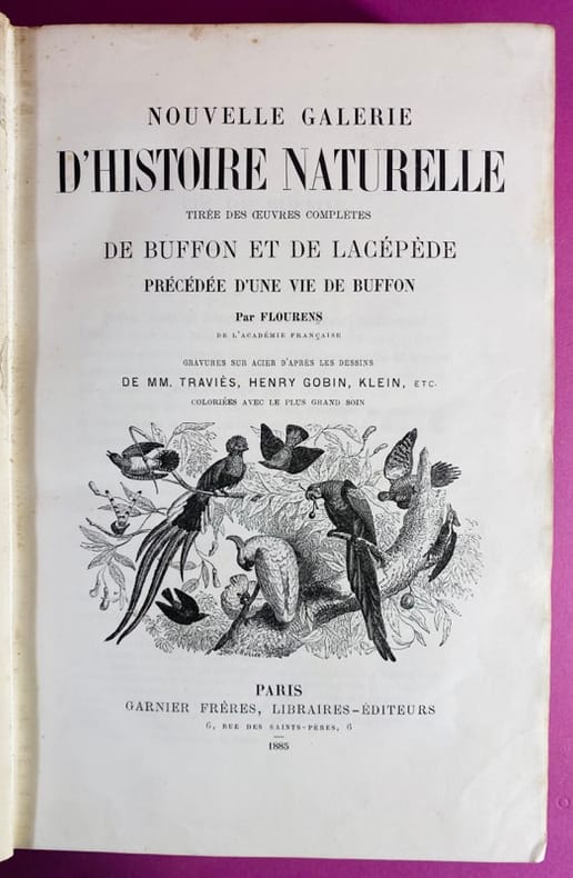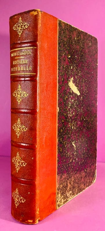 1885 Couverture rigide Paris, Garnier frères, 1885. Un volume in-4 (27,5 x 19 cm), reliure demi-chagrin rouge, filet doré d'encadrement sur les plats, dos à 5 nerfs orné de fleurons dorés, coins émoussés, quelques frottements sur les plats. Feuillet de faux-titre, feuillet de titre, XI (1), 550 (2) pages, illustrées de 30 gravures sur acier sous serpente (dont 29 sont coloriées) d'après les dessins d'Edouard Traviès, Henri Gobin, Klein (...), et de nombreuses gravures en noir in et hors-texte, rares rousseurs, planches légèrement jaunies. Cet ouvrage s'inscrit dans la tradition des grandes compilations naturalistes du XIXe siècle, reprenant et actualisant les travaux fondateurs de Buffon (Histoire naturelle, générale et particulière, 1749-1789) et de Lacépède (qui a complété l'oeuvre de Buffon après sa mort, notamment sur les reptiles, poissons et cétacés). Avec l'objectif d'offrir une synthèse illustrée et accessible des connaissances en histoire naturelle, en s’appuyant sur les textes de Buffon et Lacépède, tout en les enrichissant d’une biographie de Buffon par Flourens, lui-même naturaliste et physiologiste renommé. Bon état des planches et bon rendu des couleurs, bon exemplaire.