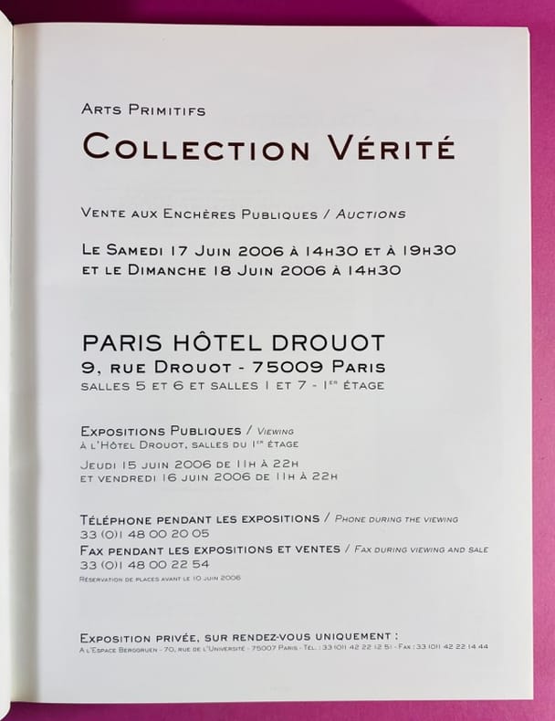 2006 Couverture rigide Paris, Enchères Rive Gauche, 2006. Un fort volume in-4 (28 x 22 cm), cartonnage de l'éditeur demi-toile avec plats cartonnés, premier plat illustré, quelques fines marques sur les tranches et au second plat, et quelques accrocs mineurs sur les bords des plats. 557 pages, illustrées de nombreuses reproductions photographiques en couleurs. En tête d'ouvrage, présentation de la collection Pierre et Claude Vérité par Pierre Amrouche. Catalogue de référence dans le domaine des Arts Premiers, proposant une riche iconographie. Poids conséquent, 3kg. Très bon état intérieur, bon exemplaire.