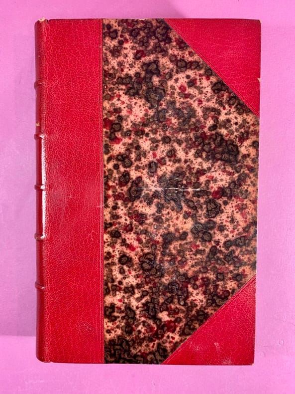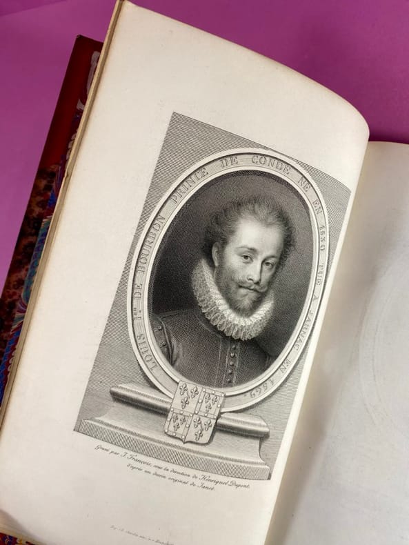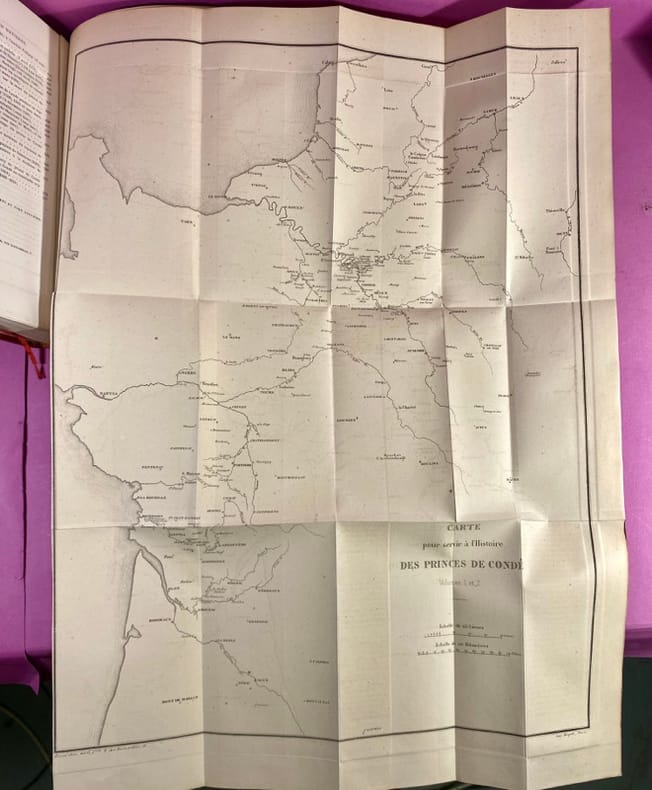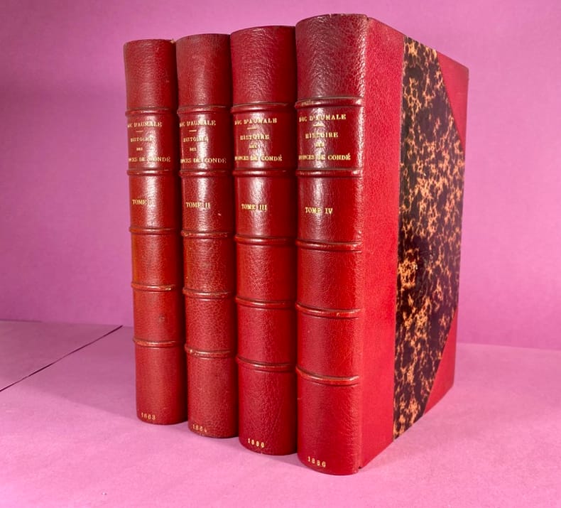 1863 Couverture rigide Paris, Michel Lévy Frères, 1863-1886. 4 volumes in-8 (23 x 15,5 cm), reliure demi-maroquin à coins rouge d'époque, dos à cinq nerfs, titre doré au dos, filets d'encadrement à froid sur les plats, papier à la cuve aux plats et contre-plats, tranche supérieure dorée, petits accrocs aux coins et quelques frottements sur les nerfs (défauts très mineurs). Tome I : frontispice, faux-titre, titre, III (1), 580 pages ; tome II : frontispice, faux-titre, titre, 588 pages, carte dépliante ; tome III : frontispice, faux-titre, titre, (4) 675 pages ; tome IV : frontispice, faux-titre, titre, (2) 675 pages ; tome III et IV partiellement non-coupés. Il s'agit des 4 premiers volumes d'un ensemble qui en comprend 8 au total, le dernier ayant été publié en 1896. Cet ensemble, écrit par le Duc d'Aumale, est l'une des contributions les plus importantes à l'historiographie française du XIXe siècle. L'oeuvre retrace l'histoire fascinante et tumultueuse de la Maison de Condé, une branche cadette de la famille royale des Bourbons, célèbre pour son rôle central dans les Guerres de Religion et la Fronde. Le Duc d'Aumale, lui-même Prince du sang et historien érudit, a rédigé cette oeuvre durant son exil, s'appuyant sur des archives familiales inédites et une recherche méticuleuse. Les volumes I et II (1863-1864) couvrent l'histoire des premiers Princes de Condé, notamment Louis Ier de Bourbon-Condé et son fils Henri Ier, acteurs clés des Guerres de Religion. Les volumes III et suivants (le dernier en 1886) sont consacrés au célèbre Louis II de Bourbon, le "Grand Condé", héros militaire et figure majeure de la Fronde. Intérieur frais dans une belle reliure d'époque, bel exemplaire de cette édition originale.