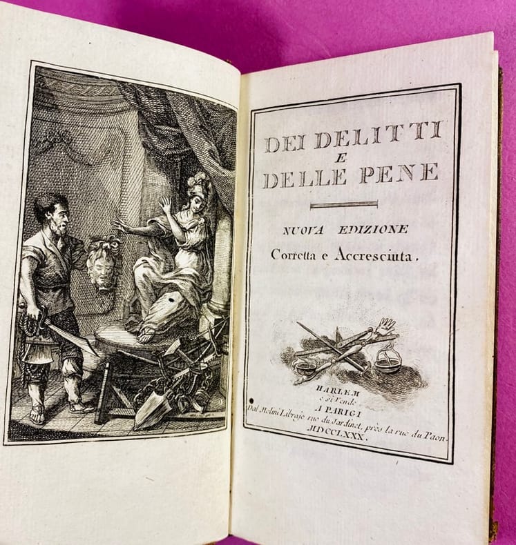 Opera del Sig. Marchese Beccaria di Milano, ridotta a miglior ordine, e corredata di note critiche dal Sig. Avvocato Massa di Mentone. appresso La Società Tipografica, Monaco (Nizza), (1784). In-16 p. (mm. 153x91), 2 volumi in 1 tomo, mz. pelle coeva con ang. (lievi abras.), titolo oro al dorso (piccole manc. anche alle cuffie), pp. XXXII,210,(6); (2),174. L'opera è così composta: - Volume I: frontespizio con vignetta xilografata; Prefazione anonima (di Ruffino Massa); A chi legge di Beccaria; testo del "Dei delitti e delle pene" diviso in 47 capitoli, ma con varie trasposizioni fra l'uno e l'altro capo dell'originale, introdotte di suo arbitrio dal Massa ed elencate da lui alle pp. XX-XXXII della Prefazione; Tavola de' capitoli della presente edizione e Tavola de' capitoli dell'edizione originale (la paginazione di quest'ultimo indice corrisponde all'edizione Harlem, 1766, stampata a Livorno dal Coltellini).- Volume II: "Risposta ad uno scritto che s'intitola: Note ed Osservazioni sul libro Dei delitti e delle pene'", Monaco (1784); frontespizio con vignetta xilografata; A chi legge (avvertimento anonimo del Massa sul contenuto del vol. II); Variazioni e giunte da farsi alle Note critiche; Risposta ad uno scritto che s'intitola Note ed osservazioni.. (cioè la replica di Pietro e Alessandro Verri contro il Facchinei); Commentario sopra il libro Dei delitti e delle pene' del Sig. di Voltaire. Così Firpo Ediz. Naz. Opere di Beccaria,I, n. 21, p. 597.Alone per lo più margin. su una decina di carte, ma complessivam. esemplare ben conservato.