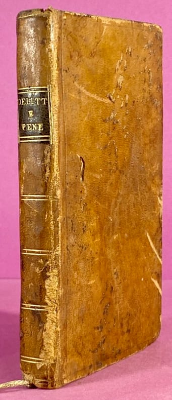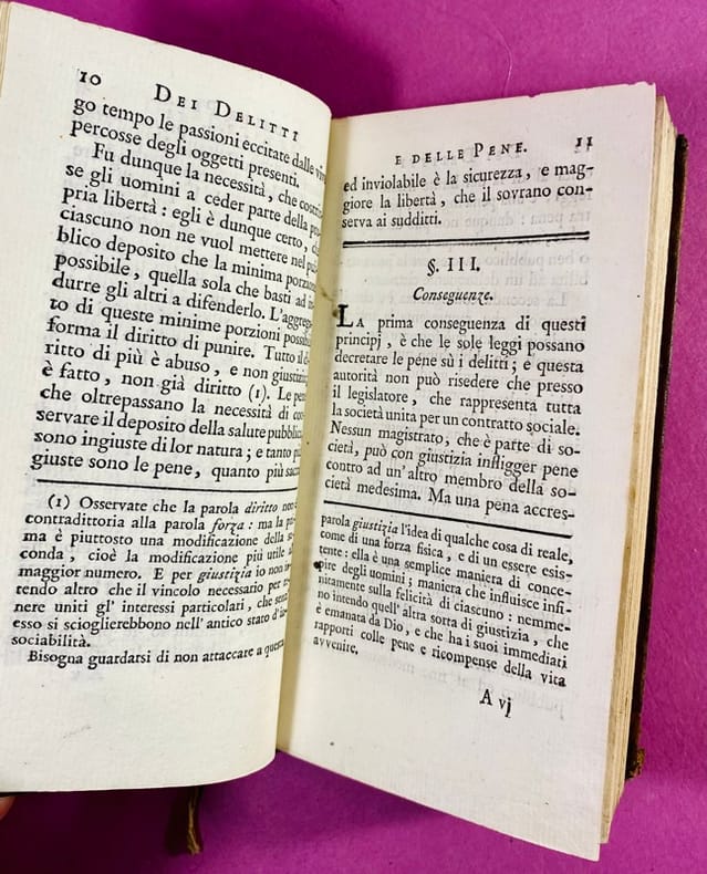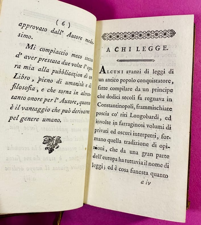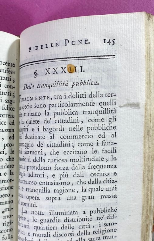 Edizione sesta di nuovo corretta ed accresciuta. s.n.t., Harlem, 1766. In-16 gr. (mm. 182x110), bella legatura in p. pelle bazzana coeva, dorso a cordoni con fregi e titolo oro su tassello, tagli rossi, pp. (4),314,(4), con 1 tavola allegorica all'antiporta e una vignetta al frontespizio (una bilancia e una spada adagiate sopra nuvole dietro le quali spunta un sole radioso). Sia la tavola allegorica che l'intero frontespizio sono incisi in rame su un'unica lastra (mm. 223x274). L'opera comprende: A chi legge (le prime VIII pp. romane); Introduzione e testo in 47 capitoli (pp. 9-195); Giudizio del De Soria (pp. 197-209); bottello e testo della Risposta contro il Facchinei (pp. 211-314); Indice dei paragrafi , ed altre cose che si contengono in questo libro (pp. 315-318).Cfr. Firpo,Opere,I, n. 12 (p. 567): Si tratta probabilmente di una contraffazione dell'edizione impressa a Parigi, per conto di Giovan Claudio Molini, nell'autunno 1766. Lieviss. fioriture, perlopiù marginali, ma certamente esemplare ben conservato..