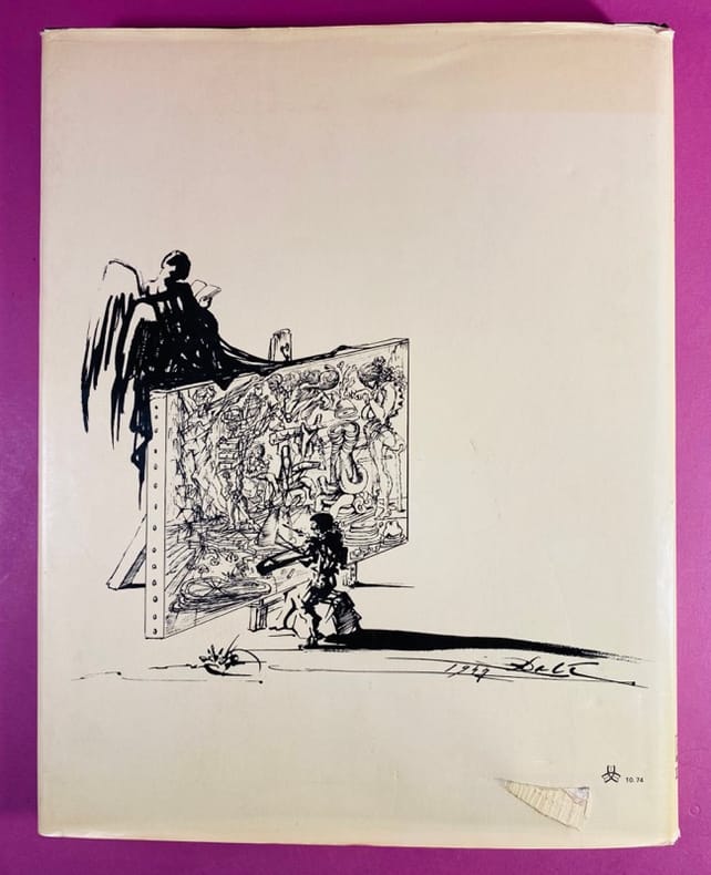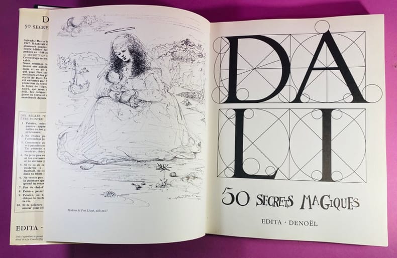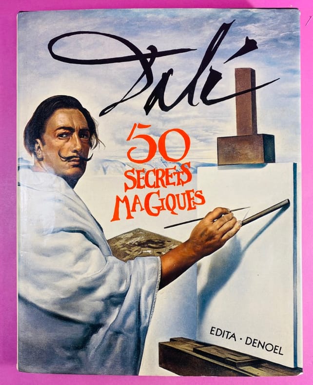 1974 Couverture rigide Lausanne, Edita/Denoël, 1974. Un volume in-4 (30 x 24 cm) relié pleine toile noire titrée, jaquette illustrée en couleurs, couverture légèrement passée, quelques accrocs à la jaquette en pied et en tête, petite éraflure au verso de la jaquette.167 pages, illustrées de nombreux croquis en noir in et hors-texte de l'artiste. Cet ouvrage de Salvador Dali se présente en 50 chapitres (ou "secrets"), chacun prodiguant un conseil sur l'art de la peinture et du dessin, allant du choix du pinceau (Secret 22 : Le Pinceau Royal) à la composition, en passant par la posture du modèle et l'état d'esprit de l'artiste. Dalí y réaffirme sa dévotion à l'hyperréalisme classique acquis auprès des anciens, tout en l'associant à sa méthode de la "paranoïa-critique" pour créer ses visions surréalistes. Bon exemplaire de cette édition originale.