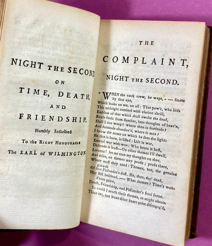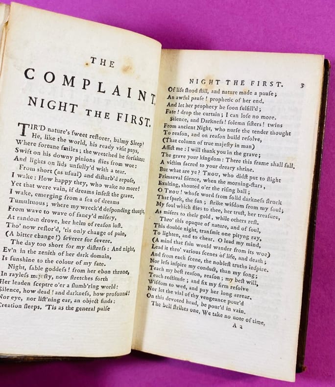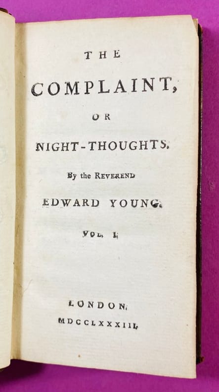 London, R. Dodsley, 1742-44 (Night 1-6), G.Hawkins, 1744-45 (Night 7-9). 4to. Contemp. Full calf. Rebacked. Titlelabel with gilt lettering. Wear to covers and edges. Corners bumped. Engraved frontispiece. First title-page with some soiling and browning. Some parts with light browning and offsettings, a few scattered brownspots. Part 2 & 3 seems to lack the Prefaces (the text begins on p. 5). No halftitles.