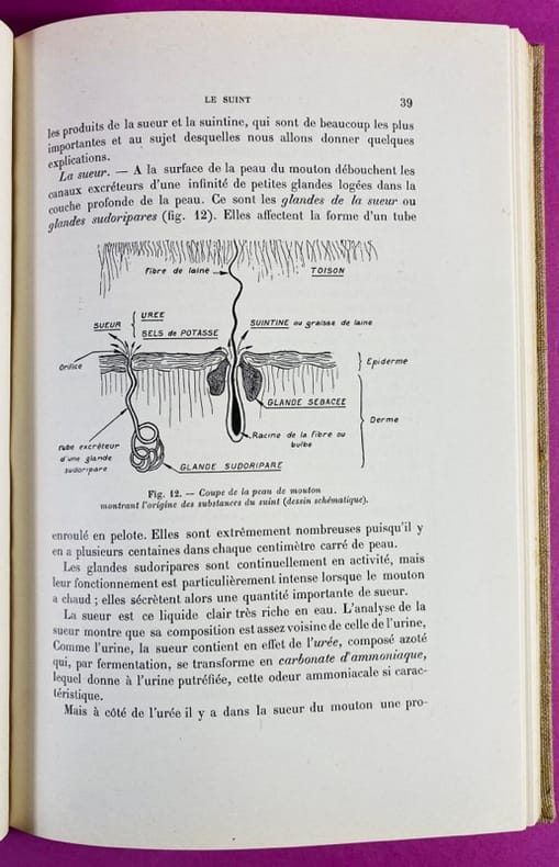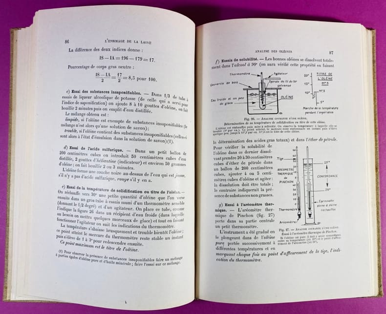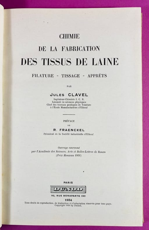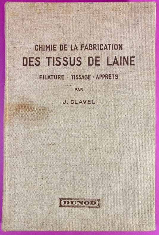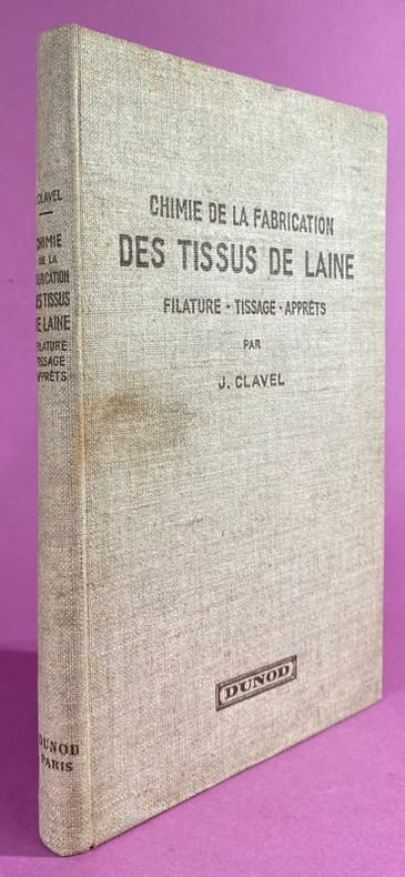 1934 Couverture rigide Paris, Dunod, 1934. Un volume in-8 (24,5 x 16,5 cm), reliure entoilée de l'éditeur, marque brune au premier plat. XIV, 228 pages, illustrées de nombreux schémas et croquis in-texte, intérieur frais. Ce traité technique complet détaille avec précision l’ensemble des processus chimiques appliqués à la laine, de la fibre brute jusqu'au produit fini. Publié en 1934, il témoigne du savoir-faire industriel français de l'époque et constitue une mine d'informations sur les procédés de teinture, de dégraissage et d'apprêt. J. Clavel était un ingénieur chimiste spécialisé dans le textile. Reconnu pour son expertise technique, il a contribué à moderniser les méthodes de traitement des fibres animales au début du XXe siècle. Ses travaux chez Dunod étaient destinés aux directeurs d'usines, aux teinturiers et aux ingénieurs, cherchant à allier la rigueur scientifique de la chimie aux besoins pratiques de la production de masse. Bon exemplaire de cet ouvrage technique.