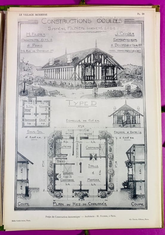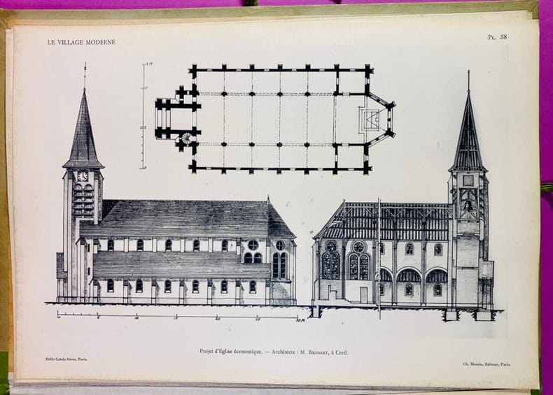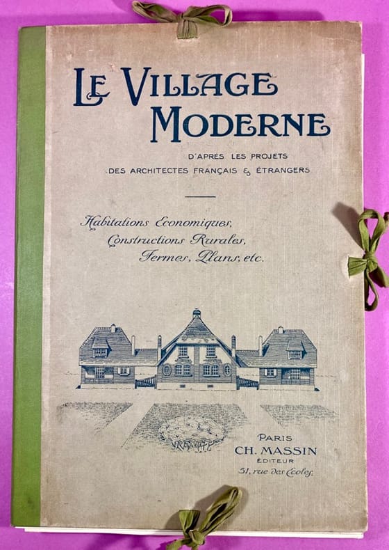 Paris, Ch. Massin, Éditeur, sans date (Circa 1920-1923). Un volume in-4 (34 x 24 cm), en feuilels, sous portfolio à lacets de l'éditeur, dos en percaline verte, plats cartonnés, le premier étant illustré, plats passés dans les marges. 2 feuillets de titre et de table, complet de ses 40 planches en héliogravure (Hélio Catala Frères), marges des planches légèrement jaunies. Ce portfolio constitue un témoignage de l'architecture de reconstruction et du mouvement des cités-jardins au début du XXe siècle. Il réunit des projets d'architectes majeurs comme Bassompierre et de Rutté (spécialistes du logement social), ainsi que des modèles d'habitations économiques, de fermes modernes et d'églises rurales (notamment par l'architecte Huillard). Les planches détaillent plans, coupes et élévations. Bon état des planches, bon exemplaire de cette édition originale.