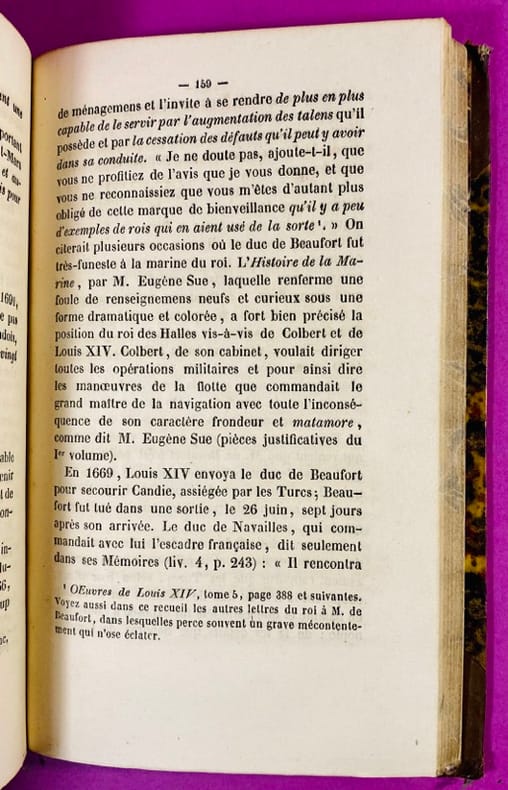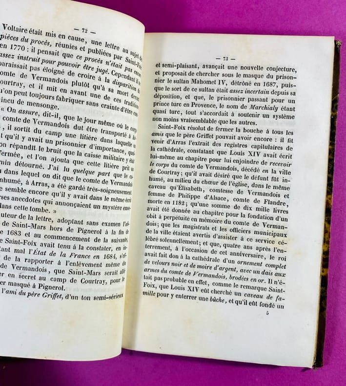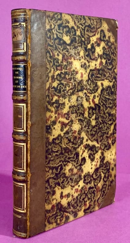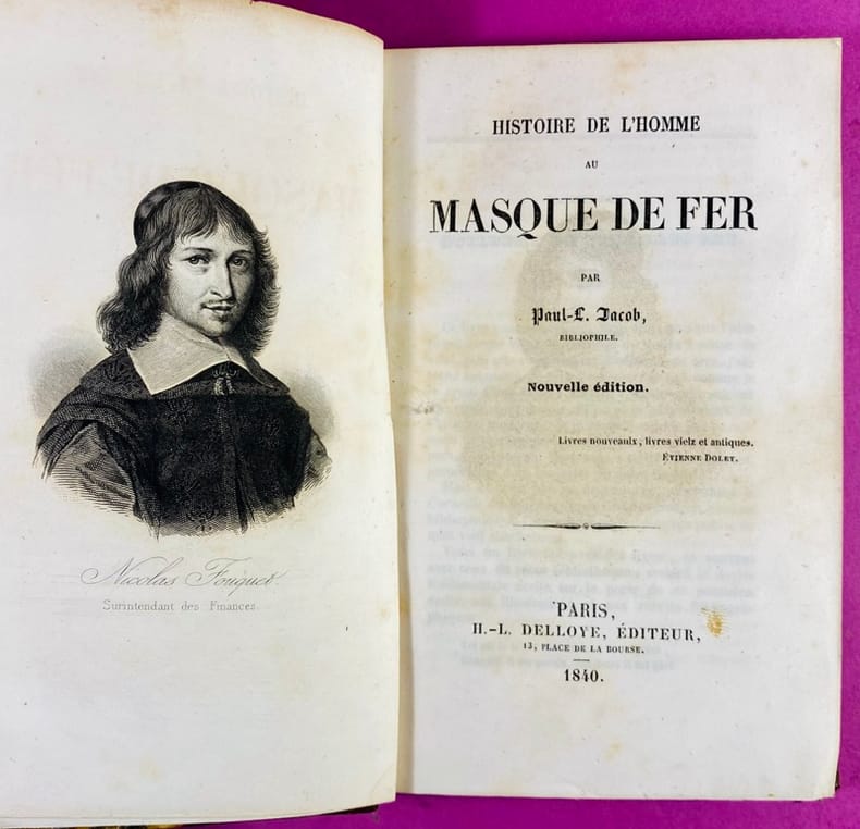 1840 Couverture rigide Paris, H.-L. Delloye, Éditeur.1840. Un volume in-12 (18 x 11,5 cm), reliure demi-veau de l'époque, dos à nerfs orné de caissons dorés, pièce de titre en maroquin noir, papier marbré sur les plats, coins émoussés, quelques frottements aux charnières, étiquette au dos en tête. Portrait en frontispice de Nicolas Fouquet, Surintendant des Finances, gravé sur acier, 269 pages, feuillet de frontispice partiellement désolidarisé, décharge du frontispice sur la page de titre, quelques rousseurs claires, feuillets légèrement jaunis à partir de la page 100. Dans cette nouvelle édition, Paul Lacroix explore les différentes théories (dont celle impliquant Fouquet, d'où le portrait frontispice) entourant l'énigme de l'homme au masque de fer. L'ouvrage est un classique de la recherche historique du XIXe siècle sur les secrets d'État de Louis XIV. Exemplaire en assez bon état.