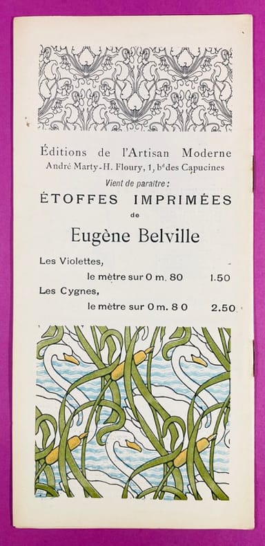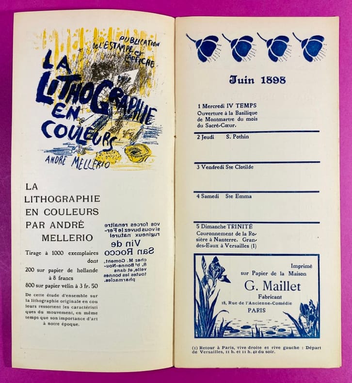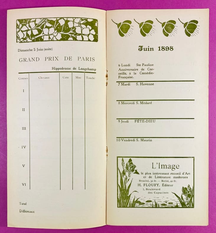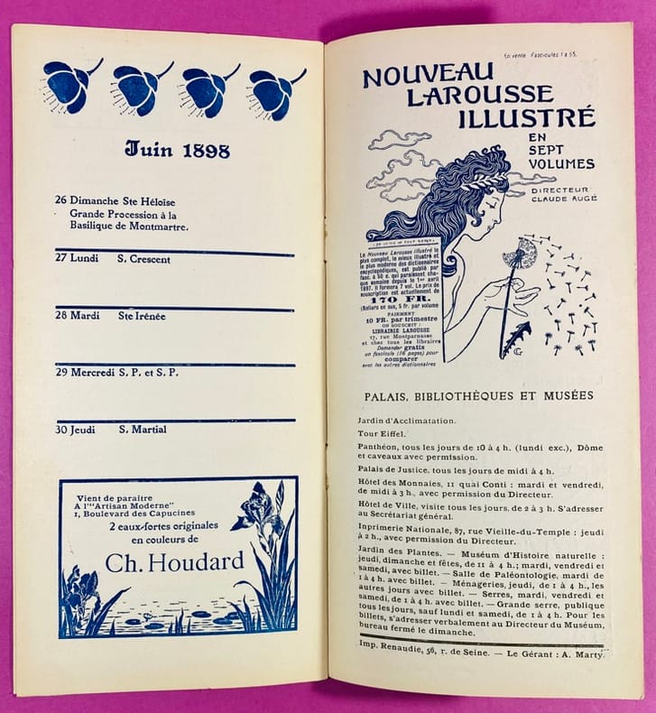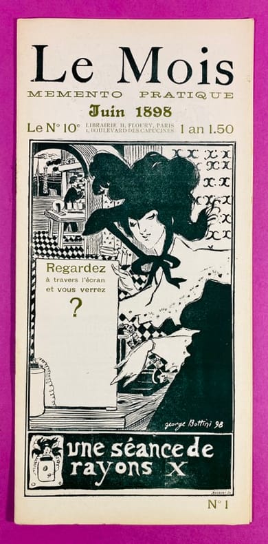 1898 Couverture souple Paris, Librairie H. Floury, 1898. Une plaquette in-12 étroit (26,5 x 12,5 cm), couverture illustrée agrafée. 12 pages non chiffrées. Rare exemplaire de ce "memento" mensuel publié par la Librairie Floury, véritable témoin de l'effervescence artistique parisienne de la fin du XIXe siècle. La couverture est ornée d'une composition originale de George Bottini (signée et datée 98 dans la planche) intitulée "Une séance de rayons X". Cette illustration typiquement Fin de Siècle met en scène une élégante devant un écran de radioscopie, une technologie alors révolutionnaire et source de fascination mondaine. L'intérieur de la plaquette comprend : des annonces pour des publications majeures de l'époque, notamment La Lithographie en couleurs d'André Mellerio (théoricien du symbolisme et du mouvement nabi) ; des publicités illustrées pour le Nouveau Larousse Illustré (dessin de Claude Augé), les eaux-fortes de Ch. Houdard, et le vin de San-Rocco ; un calendrier des événements parisiens (courses au Grand Prix de Paris à Longchamp, processions à Montmartre) ; un guide pratique des "Palais, Bibliothèques et Musées" de Paris. Plaquette dans le style Art Nouveau, avec sa mise en page aérée et ses ornements floraux stylisés (iris, fleurs de lys et motifs japonisants). Très bon état, bon exemplaire de cette publication originale.
