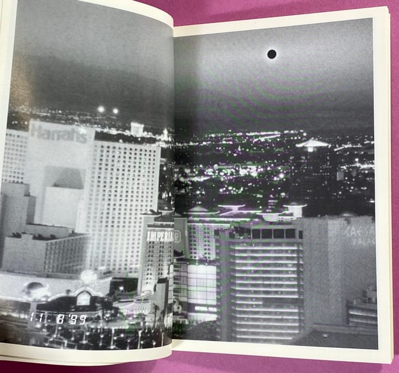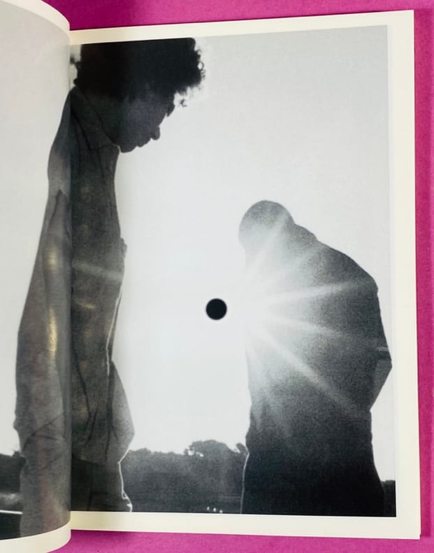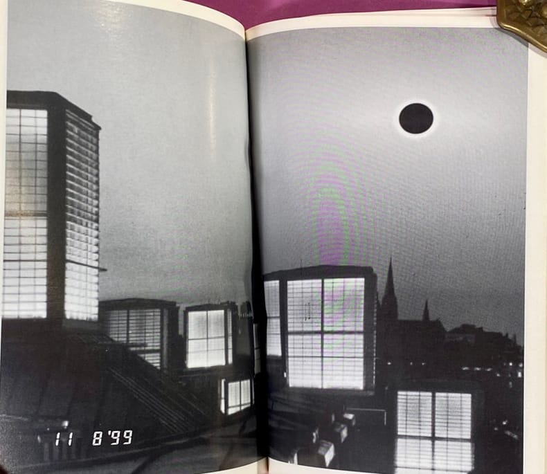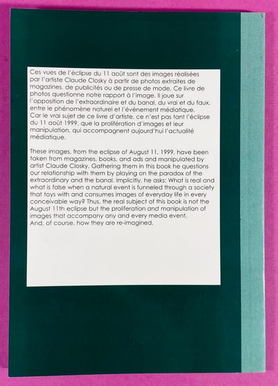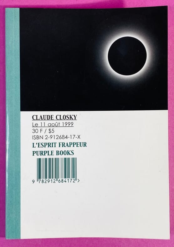 1999 Couverture souple Paris, L'Esprit frappeur / Purple Books, 1999. Un volume in-16 (15 x 10,5 cm), broché, couverture illustrée. 64 pages, reproductions en noir d'oeuvres de l'artiste, pages très légèrement gondolées (ce n'est pas dû à une mouillure ou défaut mais à la technique de brochage de cette édition). Publié à l'occasion de l'éclipse totale de soleil du 11 août 1999, cet ouvrage s'inscrit dans la démarche conceptuelle de Claude Closky, marquée notamment par l'importance du "décompte". Bon exemplaire de cette édition originale.