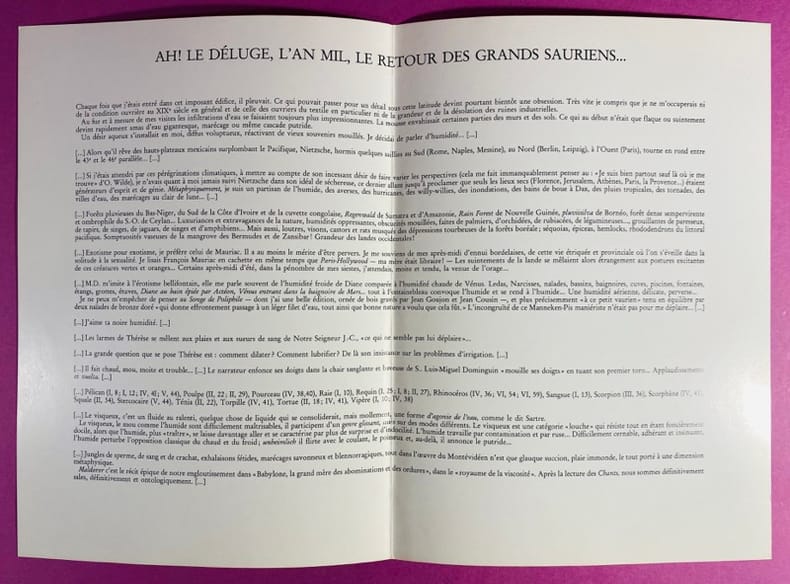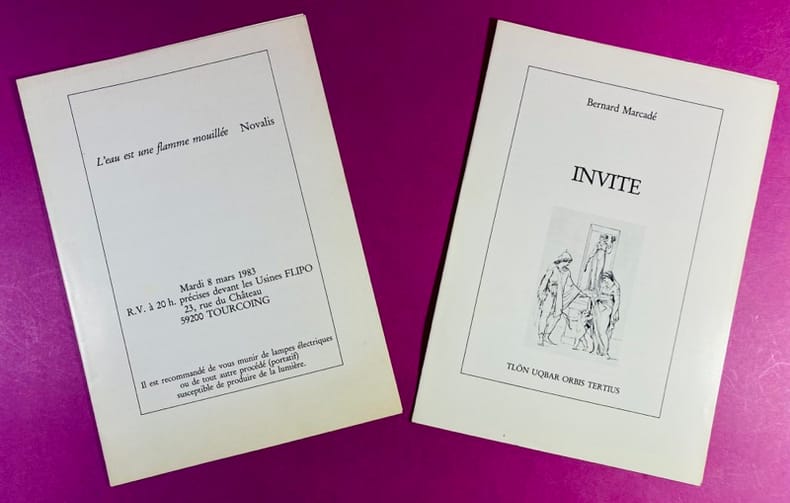 1983 Couverture souple Sans lieu, "Tlön Uqbar Orbis Tertius", 1983. En feuilles (21 x 15 cm), 2 cartons de 4 pages chacun, imprimés à l'occasion de l'événement du 8 mars 1983 organisé devant les usines Flipo à Tourcoing. Contient le texte "Ah ! Le déluge, l'an mil, le retour des grands sauriens..." Édition rare sous l'enseigne borgesienne Tlön Uqbar Orbis Tertius. Bon exemplaire, en très bon état.