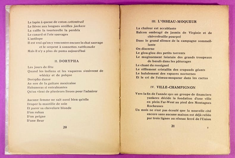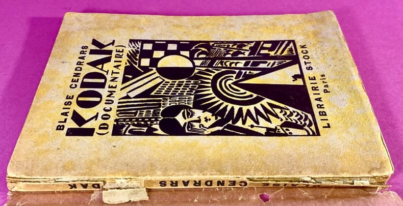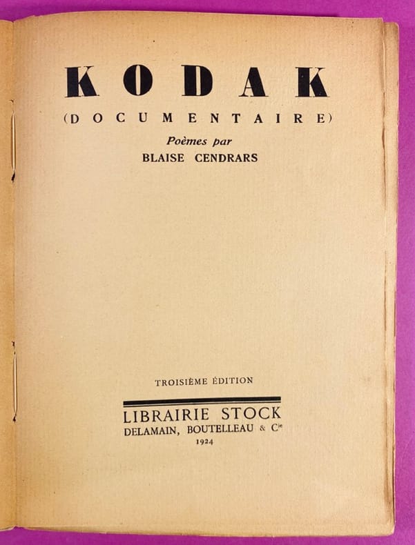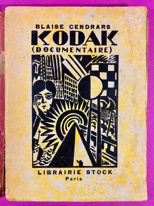 1924 Paris, Librairie Stock, Delamain, Boutelleau & Cie, 1924. Un volume in-8 (19,5 x 14 cm), broché, couverture souple sur papier moucheté jaune d'origine, illustrée d'une composition moderniste gravée sur bois par Frans Masereel, papier cristal de protection, quelques marques et rousseurs à la couverture, dos et verso de la couverture désolidarisés, manques au dos. 95 pages, cahiers solidarisés, papier jauni. Troisième édition parue la même année que l'originale. Le recueil rassemble des poèmes 'instantanés' inspirés par la modernité américaine (New York, Far West), écrits dans un style cinématographique et fragmentaire. Le recueil fut initialement intitulé Kodak avant que la marque ne s'y oppose, forçant l'ajout de la mention (Documentaire). Intérieur sain.