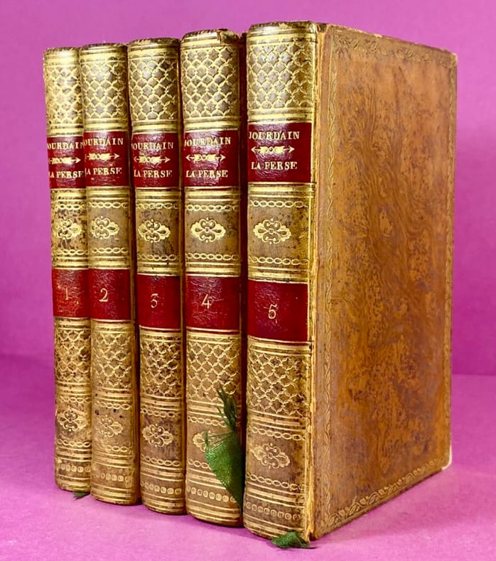 A Paris, Chez Ferra, Libraire, et J. B. Imbert, Libraire, 1814. 5 volumes grand in-16,4ff-xxipp-218pp,4ff-268pp,4ff-226pp,4ff-327pp , relié plein veau époque, filet dorés encadrant les plats, dos lisse orné, pièces de titre et tomaison , tranches et gardes cailloutées , 1 plat détaché , charnières faibles , reliures frottées . 39 planches gravées en noir d'après les peintures persanes, dont cinq frontispices, certaines repliées, joli et rare de la collection Nepveu .Atabey 624; Hage-Chahine 2388