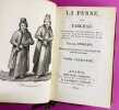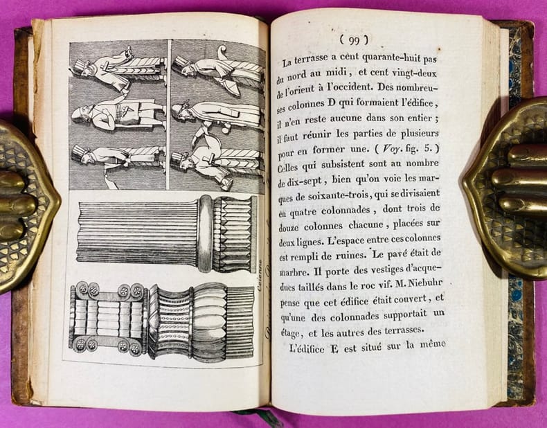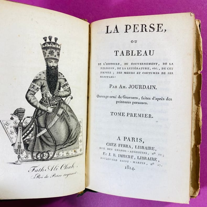 1814 Couverture rigide Paris, Chez Ferra et J.B. Imbert, 1814. 5 volumes in-16 (13,5 x 9 cm), Reliure de l'époque en plein veau raciné, dos lisses ornés de caissons et fleurons dorés, pièces de titre et de tomaison en maroquin rouge, roulettes dorées en encadrement des plats, tranches jaspées, quelques frottements aux charnières et aux coiffes, coins émoussés, petit manque à la coiffe du tome 2. Tome I : faux-titre, titre, frontispice, XV (1), 218 pages, 5 gravures dont 2 dépliantes ; tome 2 : faux-titre, titre, frontispice, 268 pages ; tome 3 : faux-titre, titre, frontispice, 225 pages (avec erreur de pagination lors de l'impression, en fin de volume), 6 gravures dont 2 dépliantes ; tome 4 : faux-titre, titre, frontispice, 290 pages, 14 gravures dont 2 dépliantes ; tome 5 : faux-titre, titre, frontispice, 327 (1) pages, 6 pages non chiffrées d'errata et de tables, 9 gravures. Soit un total de 39 gravures en noir incluant les 5 frontispices, intérieur légèrement jauni, rares rousseurs. Publié en 1814, cet ouvrage d'Amable Jourdain s'inscrit dans l'intérêt du 1er Empire pour la Perse de la dynastie Qajar. Jourdain, l'un des plus brillants orientalistes de sa génération et disciple de Silvestre de Sacy, a conçu ce "Tableau" comme une synthèse rigoureuse destinée à un public cultivé. À une époque où les voyages vers l'Orient restaient périlleux, ce livre a constitué l'une des sources d'information les plus fiables sur l'Empire perse. L'intérêt majeur de cette édition réside dans ses 39 planches. Contrairement à beaucoup d'ouvrages de l'époque qui utilisaient des gravures de fantaisie, Jourdain précise que ses illustrations sont fidèlement copiées d'après des peintures originales ramenées de Perse. Wilson, p. 113, Quérard, IV, p. 251. Bon exemplaire de cette édition originale.