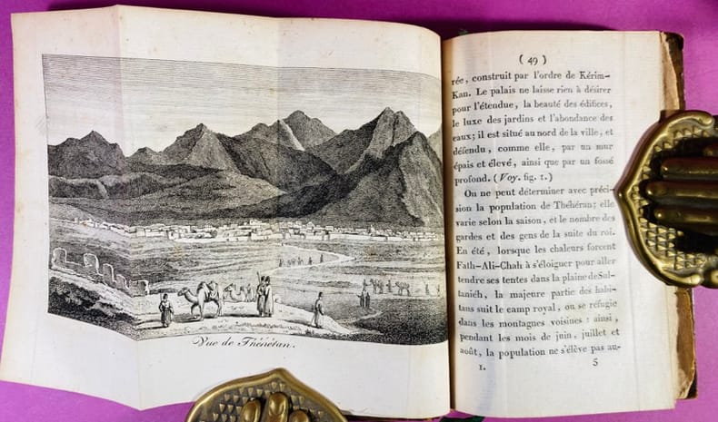 4 volumes sur 5 (manque le second tome) de l’œuvre de Jourdain sur la Perse, tirée des meilleures relations sur la région par Tavernier, Chardin, Thevenot, etc…, illustré de 38 (39) planches gravées en noir d'après les peintures persanes, dont 4 frontispices, certaines repliées, le second tome, ici absent ne possède qu’une seule planche, jolie et rare édition de la collection Nepveu. Atabey 624; Hage-Chahine 2388 Amable Jourdain (Paris 1788 -1818) est un historien et orientaliste français, élève de Louis-Mathieu Langlès et d'Antoine-Isaac Silvestre de Sacy, spécialiste de la Perse antique et de la transmission latine d'Aristote. M2-Et3