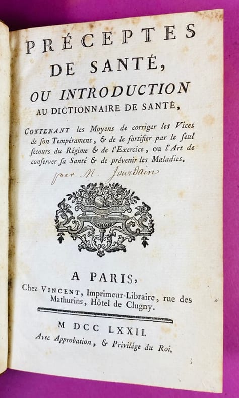 Jourdain, médecin reconnu du XVIIIe siècle, développe une approche préventive de la médecine, en insistant sur l'importance du "régime" (l'hygiène de vie) et l'exercice physique pour maintenir l'équilibre des tempéraments. En 1772, la médecine s'éloigne des superstitions pour se concentrer sur l'observation et l'hygiénisme. Jourdain est une figure de cette transition. Conformément à nos conditions générales de vente :Les frais de port sont affichés à titre indicatif. Il se peut que nous devions vous contacter pour vous informer du coût de laffranchissement supplémentaire en fonction du poids et du nombre de livres, surtout pour les envois internationaux Cependant vu l'augmentation des tarifs postaux à l'internationale, nous pouvons expédier les ouvrages en point relais MONDIAL RELAY pour les pays suivants : Allemagne, Autriche, Belgique, Espagne, Italie, Luxembourg, Pays-Bas, Pologne, et Portugal. Merci de nous indiquer en retour le point relais choisi ainsi que votre numéro de téléphone mobile & adresse Courriel pour assurer le suivi du colis.N'hésitez pas à nous interroger.In accordance with our general terms and conditions of sale:Shipping costs are displayed for informational purposes only. We may need to contact you to inform you of the additional postage costs depending on the weight and number of books, especially for international shipments.However, given the increase in international postal rates, we can ship books via Mondial Relay to the following countries: Germany, Austria, Belgium, Spain, Italy, Luxembourg, Netherlands, Poland, and Portugal. Please provide us with your chosen Mondial Relay point, as well as your mobile phone number and email address to ensure package tracking.Please feel free to contact us with any questions