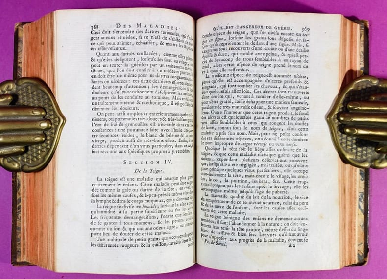 Paris, Vincent, 1771-1772. 1920 g 4 volumes in-8, plein veau, dos ornés à nerfs, filet sur les coupes, tranches rouges, [1] ff., xxiv-592 pp.; [1] ff., 580 pp.; viii-742 pp.; xl-600 pp.. Illustré dans le 3e volume de 2 planches dépliantes hors-texte montrant les instruments de la chirurgie. Les deux premiers volumes sont de la quatrième édition qui est ''revue, corrigée et considérablement augmentée''; leurs titres annoncent comme auteurs M. L***, ancien médecin des armées du roi et M. de B***, médecin des hôpitaux. Mais Barbier (I, 982) attribue cet ouvrage à Charles Auguste [Augustin] Vandermonde. Le premier à avoir dévoilé l'idendité de l'auteur est M. Roux auteur de l'Eloge de Vandermonde en 1762 (Journal de médecine, chirurgie, pharmacie de juillet 1762, Tome XVII, pp. 9 ). Les deux volumes suivants (Dictionnaire de chirurgie et Préceptes) datés de 1771 et 1772 sont en première édition. Le dernier volume, ''Préceptes ...'', est rarement joint mais ce trouve ici relié en reliure uniforme avec les trois autres, il en forme une utile introduction comme son titre l'annonce. Il est l'oeuvre de A.-L.-B. Bréchillet-Jourdain d'après Barbier (III, 971). Signature de l'éditeur Vincent au verso du titre qui certifie cette édition. Bel ensemble, rare avec les quatre volumes réunis en reliure uniforme. Ex-libris de Mr de Savignac [Savignhac] (château de Villevoisin proche de Ploërmel); ex-libris manuscrit de Mlle de Savignhac; et cachet-ex-libris couronné du château breton de La Villeder. Frottements à deux pièces de titres et quelques usures aux coiffes mais bon exemplaires. . (Catégories : Médecine, Santé, Chirurgie, )