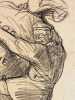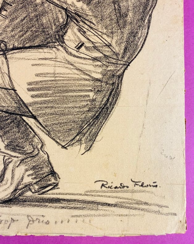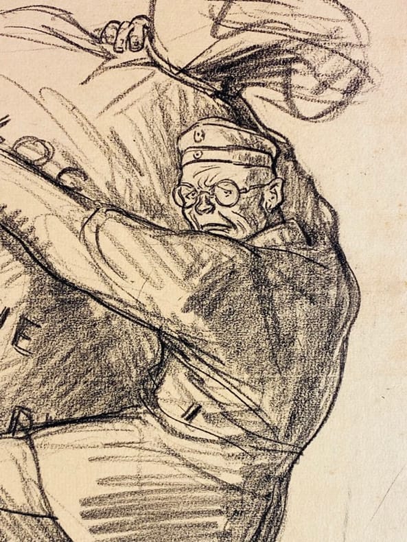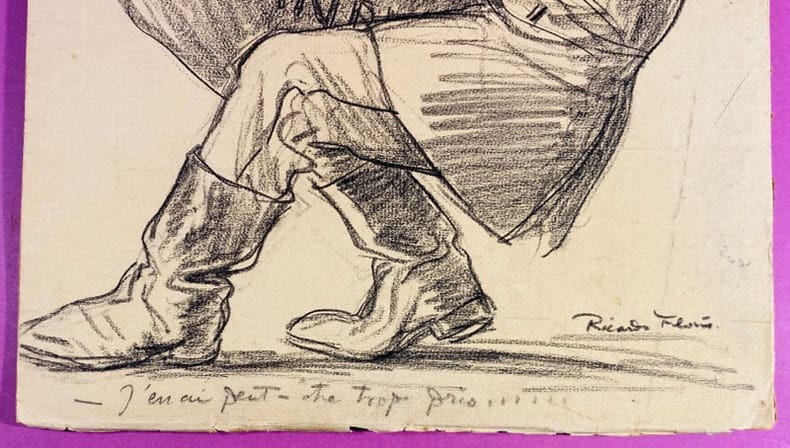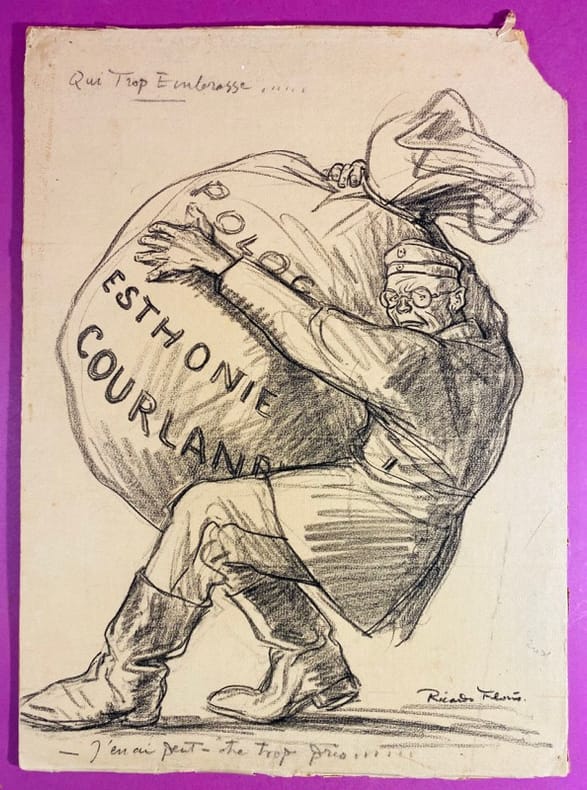 1917 Dessin original sur papier à la pierre noire (ou crayon gras), sans date (circa 1917-1918), contrecollé sur carton. Dimension feuille : 32 x 22,5 cm environ. Signé par l'artiste en bas à droite. Porte un titre manuscrit en haut à gauche : « Qui Trop Embrasse..... » et une légende manuscrite au crayon dans la marge inférieure : « – J’en ai peut-être trop pris !!! ». Papier légèrement jauni, un petit manque dans l'angle supérieur droit, quelques légères marques de manipulation. Oeuvre satirique de la période de la Grande Guerre, caractéristique du trait incisif de Ricardo Florès, et destinée à la presse de l'époque. Cette caricature fait directement référence aux ambitions territoriales de l'Empire allemand sur le front de l'Est et aux négociations du traité de Brest-Litovsk. La mention de la Courlande et de l'Estonie situe précisément l'oeuvre vers la fin de l'année 1917 ou le début de 1918, au moment où l'Allemagne tente d'absorber ces territoires russes en décomposition. L'artiste utilise le proverbe « Qui trop embrasse, mal étreint » pour souligner la fragilité de l'expansionnisme germanique, au bord de l'asphyxie. Ricardo Florès (1878-1918) est un peintre et caricaturiste français, figure de la presse satirique de la Belle Époque et de la Grande Guerre. Il meurt de la grippe espagnole en 1918, peu avant la fin des hostilités.