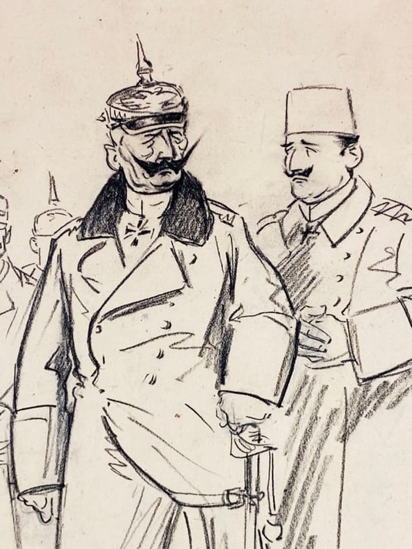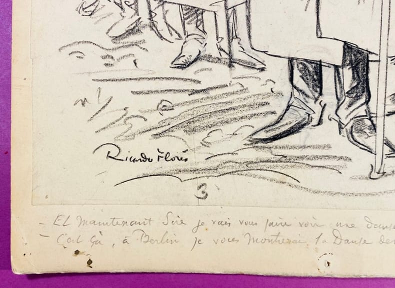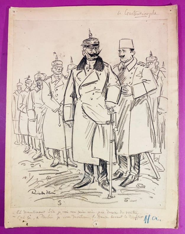 1915 Dessin original sur papier à la pierre noire (ou crayon gras), sans date (circa 1915-1916), contrecollé sur carton. Dimension feuille : 33 x 25 cm. Signé par l'artiste en bas à gauche. Porte une annotation manuscrite en haut à droite : « À Constantinople » et une légende manuscrite au crayon dans la marge inférieure : « - Et maintenant Sire je vais vous faire voir une danse du ventre..... - C'est ça, à Berlin je vous montrerai la Danse devant le Buffet ». Papier légèrement jauni, petites marques de punaises dans les angles du carton, quelques marques d'usage, bon état général. Oeuvre satirique de la période de la Grande Guerre, caractéristique du trait incisif de Ricardo Florès, et destinée à la presse de l'époque. La scène représente l'Empereur d'Allemagne Guillaume II (reconnaissable à sa moustache caractéristique et son casque à pointe) en visite chez son allié, le Sultan ou un haut dignitaire ottoman (portant le fez). L'humour de Florès joue ici sur le contraste entre l'exotisme oriental (« la danse du ventre ») et la réalité économique difficile de l'Allemagne sous blocus allié. La réponse de Guillaume II, évoquant la « Danse devant le Buffet » (expression populaire désignant le fait de rester sur sa faim ou de n'avoir rien à manger), souligne avec ironie les privations alimentaires qui commençaient à frapper Berlin et le Reich dès 1915. Ricardo Florès (1878-1918) est un peintre et caricaturiste français, figure de la presse satirique de la Belle Époque et de la Grande Guerre. Il meurt de la grippe espagnole en 1918, peu avant la fin des hostilités.