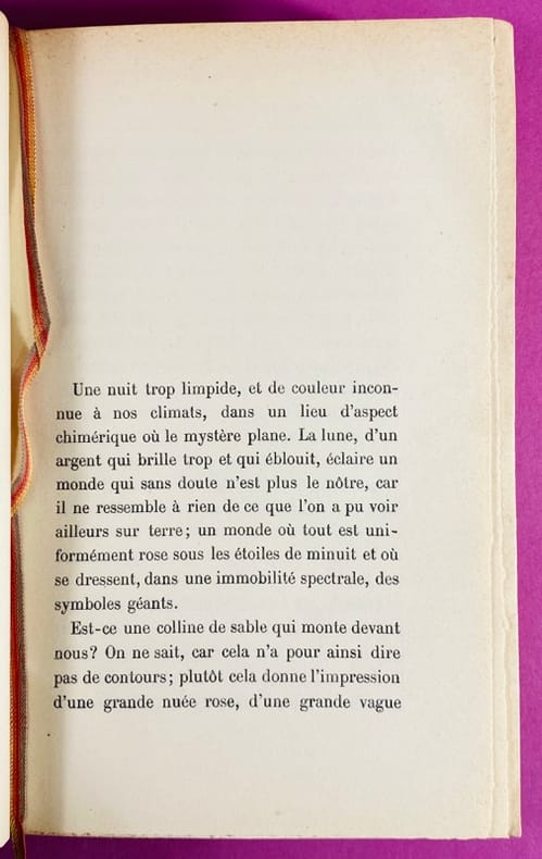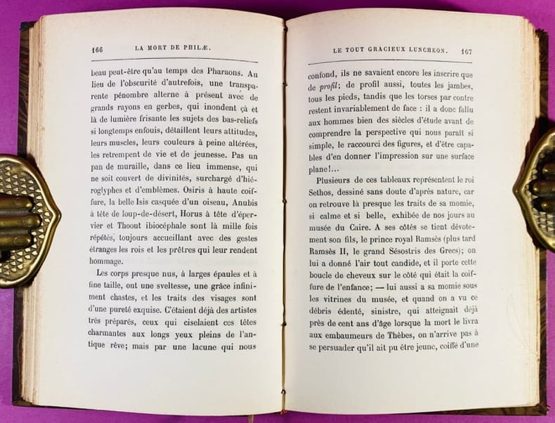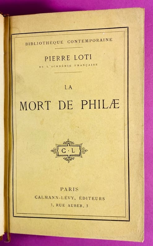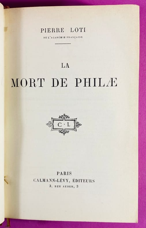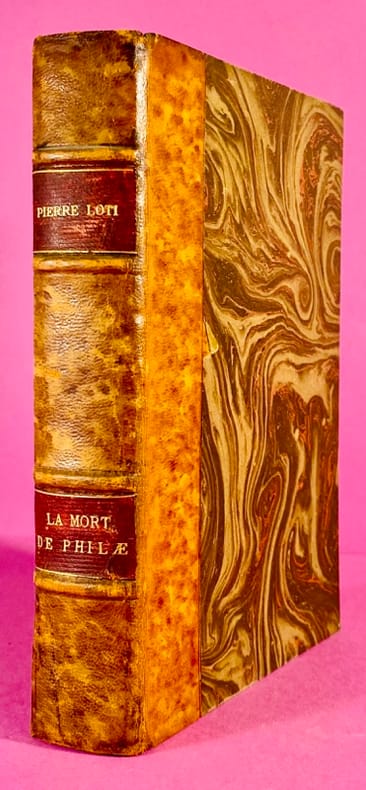 1908 Paris, Calmann-Lévy Editeurs, 11-1908. Un volume in-12 (19 cm x 12,5 cm), reliure demi-basane postérieure, dos à 4 nerfs, titre doré, papier à la cuve aux plats et contreplats, tranche supérieure dorée, charnière inférieure fendue en pied sur 4 cm, accroc au papier du 1er plat, couverture d'origine et dos conservés (quelques marques d'usage, petit manque au coin inférieur du verso). 356 pages. Pierre Loti, officier de marine et grand voyageur, exprime ici sa tristesse et sa colère devant la disparition de l'Égypte traditionnelle. Le titre fait référence à l'île de Philae et son temple, condamnés à être engloutis par les eaux du premier barrage d'Assouan construit par les Anglais. Bon exemplaire de cette édition originale sur papier courant.