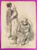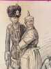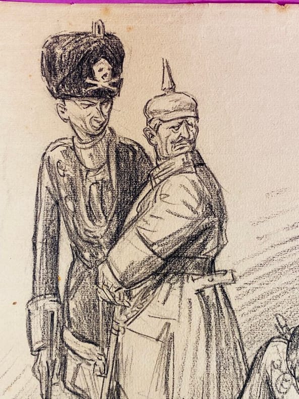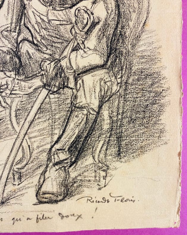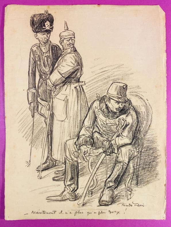 1915 Dessin original sur papier à la pierre noire (ou crayon gras), sans date (circa 1914 - 1915). Dimensions : 31,5 x 24 cm. Signé par l'artiste en bas à droite. Légendé à la main : "- Maintenant il n'a plus qu'à filer doux !". Papier légèrement jauni, quelques rousseurs éparses. Oeuvre satirique de la période de la Grande Guerre, caractéristique du trait incisif de Ricardo Florès, et destinée à la presse de l'époque. La scène représente le Kaiser Guillaume II flanqué d'un hussard de la garde impériale au colback orné de la tête de mort (Totenkopf), tous deux regardant avec mépris un soldat autrichien (reconnaissable à sa Kappe) assis et prostré. Le dessin illustre de façon mordante la mise sous tutelle de l'allié autrichien par l'Allemagne après les premiers revers du conflit. Ricardo Florès (1878-1918) est un peintre et caricaturiste français, figure de la presse satirique de la Belle Époque et de la Grande Guerre. Il meurt de la grippe espagnole en 1918, peu avant la fin des hostilités. Dessin en bon état.