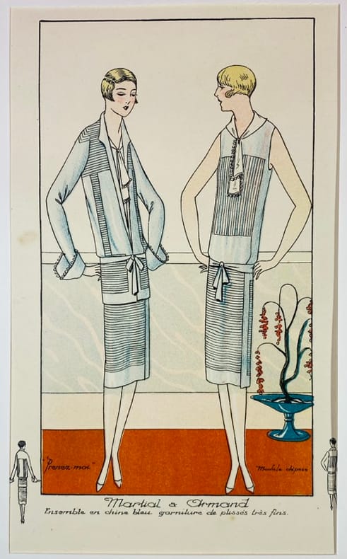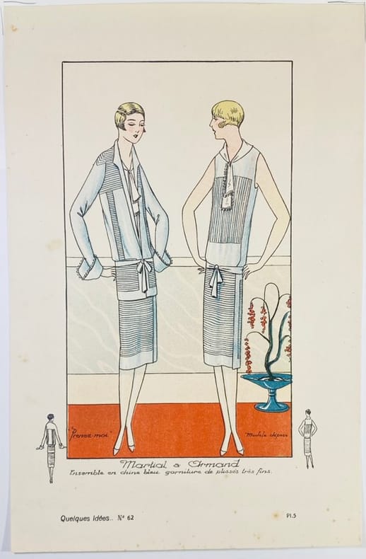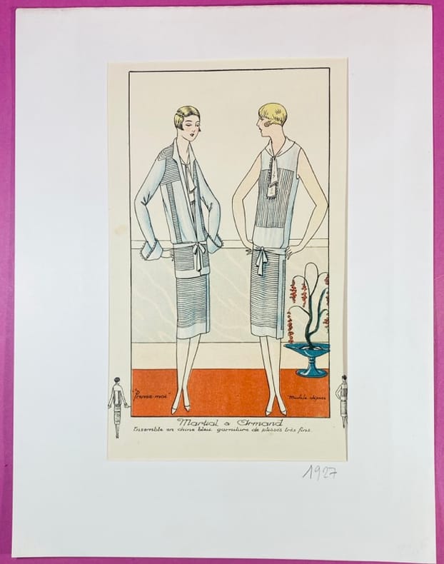 1927 Paris, Quelques Idées, album mensuel, 1927. Planche de mode originale en couleurs (lithographie) contrecollée sous marie-louise, de dimension 32 x 24,5 cm. Planche 5 du N°62. Légères marques d'usage sur la marie-louise au bord supérieur, présence de quelques rousseurs éparses. Date "1927" inscrite au crayon en bas à droite sur le montage. Cette planche présente une création de la maison Martial & Armand intitulée "Prenez-moi" : un ensemble en chine bleu avec une garniture de plissés très fins. Esthétique emblématique du style Art Déco des années folles. Planche originale en bon état.