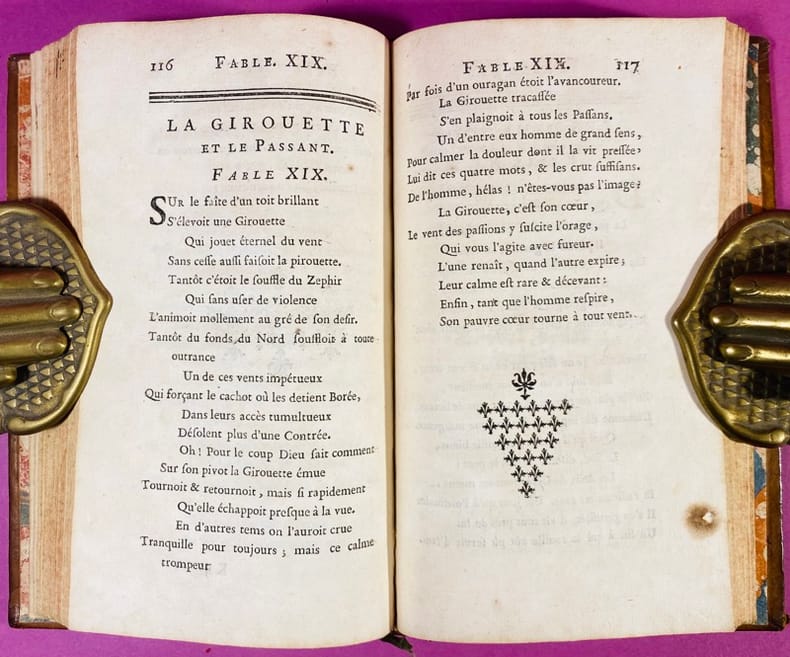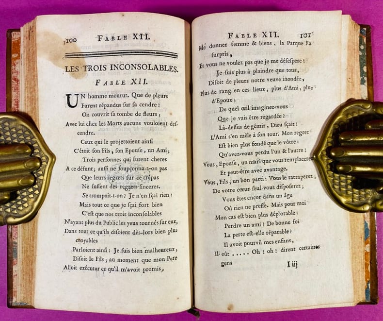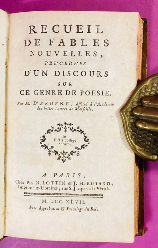 1747 Couverture rigide Paris, Ph. N. Lottin & J. H. Butard 1747. Un volume in-12 (16 x 10 cm) reliure pleine basane mouchetée de l'époque, dos à cinq nerfs orné de fleurons dorés, signet vert, tranches jaspées, petit manque de cuir au 1er plat et quelques frottements, quelques fines craquelures aux mors, exemplaire qui baille légèrement à l'ouverture. Feuillet de titre, viij 188 pages, bandeau, lettrine, culs de lampe, mouillure page 100 (voir photo), intérieur jauni. Édition originale (seule édition ancienne séparée) de ce recueil du Père d'Ardene, botaniste de renom et membre de l'Académie de Marseille. L'ouvrage s'ouvre sur un important "Discours sur la Fable", où l'auteur théorise le genre après La Fontaine. Ses fables se distinguent par une observation fine de la nature, nourrie par ses travaux de savant. Rare.Cioranescu (I, 7801). Texte en bon état, bon exemplaire de cette édition originale.