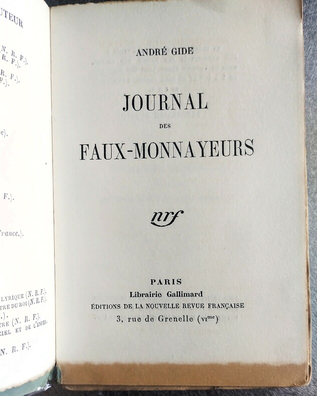 Edition originale tirée à 562 exemplaires. Un des 500 n° sur Hollande Van Gelder blanc (n° 367). Aux prises avec ses Faux-Monnayeurs, Gide nota sur un " journal " particulier, de juin 1919 à juin 1925, tout ce qui avait trait à son roman. Il publia ces notes l'année suivante. " Le roman les Faux-Monnayeurs et sa critique de genèse par M. André Gide lui-même : Le Journal des faux-monnayeurs, forment deux oeuvres à ce point inséparables qu'elles n'en constituent plus, à vrai dire, qu'une seule aujourd'hui. C'est un Journal d'une effrayante lucidité. André Gide, durant cette gestation, ne cessa pas une minute de s'observer, de se juger... " (article de presse joint). Photos sur demande.