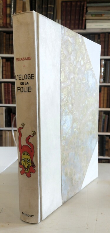 Un volume in-12°, reliure plein maroquin de couleur marron-grenat, avec les deux plats encadrés par trois filets dorés, avec un dos à 4 nerfs séparés par des caissons ornés de fleurons dorés et une pièce de titre de couleur marron clair portant exclusivement le titre: L’ELOGE DE LA FOLIE. Les contreplats sont ornés d’une élégante frise à la roulette. Après une page de garde, l’ouvrage s’ouvre sur un frontispice (allégorie de la folie), en regard duquel on trouve la page de titre sur laquelle figure une vignette dessinée par B. PICART. Puis vient un ensemble de 11 feuillets non chiffrés: le Privilège signé par A Heinsius, l’Avertissement de l’Editeur, la Préface du Traducteur (M. de Gueudeville) et enfin la Préface d’ERASME “adressée à Thomas MORUS” datée du 10 juin 1508. Le célèbre texte d’ERASME peut alors commencer, s’ouvrant sur un nouveau frontispice où l’on voit les portraits d’ERASME, de Thomas MORE et d’HOLBEIN suivis de la fameuse DÉCLAMATION ( la Folie parle, et sa voix va déclamer jusqu’à la fin du text, au bout de 234 pages). La voix de la Folie va se trouver soutenue et amplifiée dés les premières pages par les gravures de HOLBEIN qui sont au nombre de 74 hors-texte, plus 6 grandes gravures dépliantes. Elle sont aussi suprenantes les unes que les autres. Elles ont été inspirées par les dessins à la plume exécutés par HOLBEIN LE JEUNE (vers 1523) dans les marges d’un exemplaire édité par FROBEN, conservé dans un Musée de BASLES, et dont la réédition n’aura lieu qu’en 1676. Le texte d’ERASME est suivi d’une “Table des Principales Matières contenue dans cette DÉCLAMATION”. Ce texte, écrit par ERASME (1466 -1536), est un des textes les plus universellement connus de la Renaissance, un texte où, par par la satire, le burlesque et l’allégorie, ERASME se livre à une critique virulente des catégorise sociales les plus plus puissantes et les plus en vue : moines, théologiens, haut clergé, courtisans etc... Mais peu à peu, vers la fin de son ouvrage, ERASME prend la place de la Folie , annonce les châtiments encourus par les puissants et présente les véritables idéaux du chrétien. François l’Honoré, l’Éditeur , eût les honneurs d’une exposition à la BNF. Editeur, libraire et imprimeur originaire de Sedan, il dut fuir les troubles religieux que connurent les Ardennes ( en raison de la révocation de l’Edit de Nantes en 1685) où vivaient beaucoup de protestants. Il s’installa aux Pays-Bas et exercera à La Hague avant d’être reçu bourgeois de la ville d’Amsterdam puis de finir sa vie, en 1748, au Portugal. Exemplaire en TRES BEL ETAT.