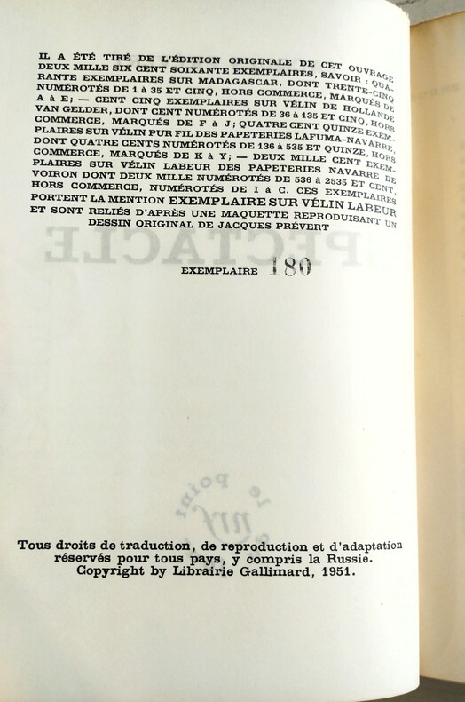 Paris,Nrf,le Point du jour,1951, édition originale.Broché in-12,365 pp., couverture rouge à rabats, exemplaire non rogné et presque intégralement non coupé,(page 16). Dos légèrement bruni,gardes inégalement ombrées.Traces de frottements à la couverture.Tirage de l'édition originale limité à 2600 exemplaires.Notre exemplaire,un des 415 exemplaires sur vélin pur fil des papeteries Lafuma.(N°180),troisième grand papier.H01