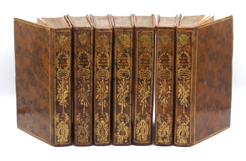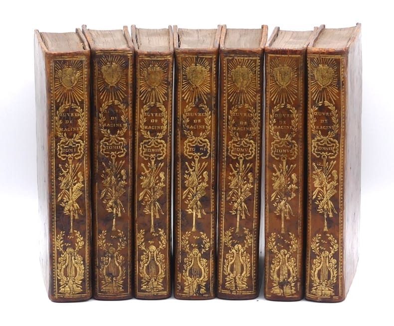"Cette édition, plus complète que les précédentes, renferme tout ce qui avait été imprimé jusqu'alors des écrits de Racine y compris le Banquet de Platon, les pièces publiées par Louis Racine en 1747, les oeuvres attribuées à Racine et certaines pièces qui ne se trouvaient pas dans les éditions précédentes. Premier tirage de l'illustration : portrait de Racine par Santerre gravé par Gaucher, 12 gravures dessinées par Gravelot gravées par Duclos, Flipart, Le Mire, etc... Bien complet de la liste des souscripteurs. Gravelot, le vignettiste par excellence. Elève de Boucher, il excelle dans les scènes animées ou spirituelles. Son interprétation du théâtre racinien est autrement gracieuse que les figures un peu sèches et solennelles du peintre Le Brun. Les chastes et tendres créations d’Andromaque et d’Iphigénie, y gagnent une élégance coquette que Pons semble désavouer: ""Gravelot fait descendre la tragédie de la scène au boudoir."" C’est faire le procès du siècle de Louis XVqui détesta le style noble et les règles surannées. Au temps de Gravelot, le texte devenu prétexte à un art d’agrément, l’image n’avait plus à délivrer un enseignement. Dès lors, le théâtre de langue française, avant de pénétrer dans les salles de classe au siècle suivant, trouva place dans les cabinets d’amateurs pour autant que l’édition fût de luxe, le format maniable, l’illustration ""piquante"". Belles et élégantes reliures signées aux bas des dos des tomes I et VII de Langlois. Il fut relieur à Lyon vers le milieu du XVIIIe siècle. Ses reliures sont rares. Thoinan, Les relieurs français, ne le cite pas. Seul Seymour de Ricci (French signed bindings in the Mortimer L. Schiff collection), reproduit deux de ses reliures : - N° 110, pour une édition des Contes de Marmontel (1765), avec une signature identique à celle de notre exemplaire. - N° 111, pour une édition des Satyres de Régnier (1733), avec une signature légèrement différente. Ex-libris Vaivolet, lieutenant particulier du baillage de Villefranche en Beaujolais."