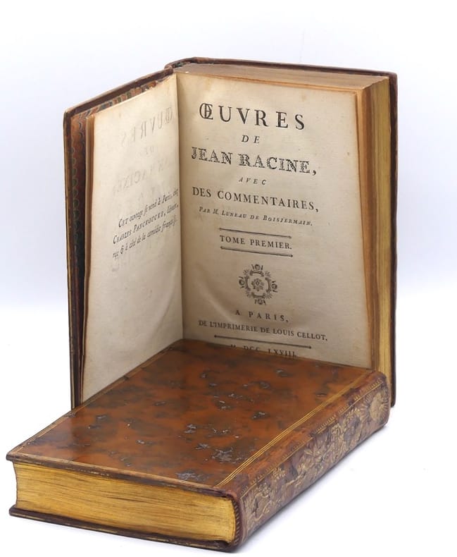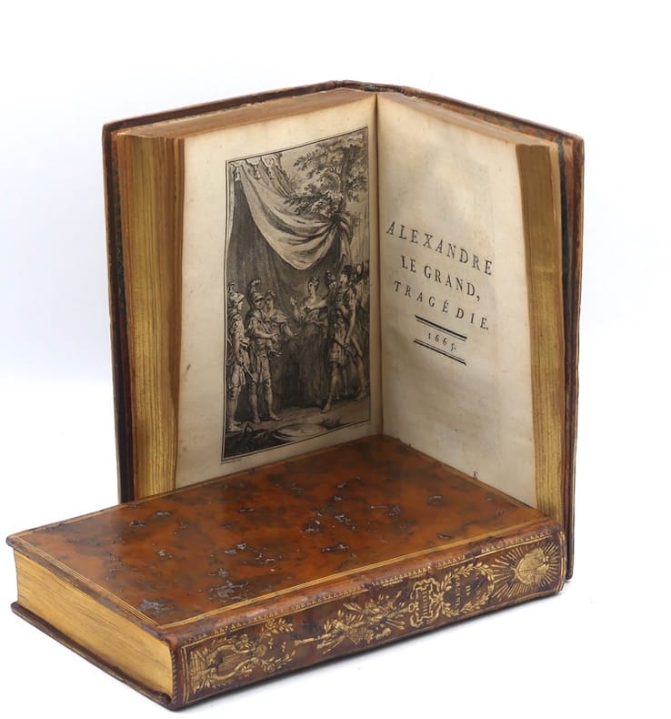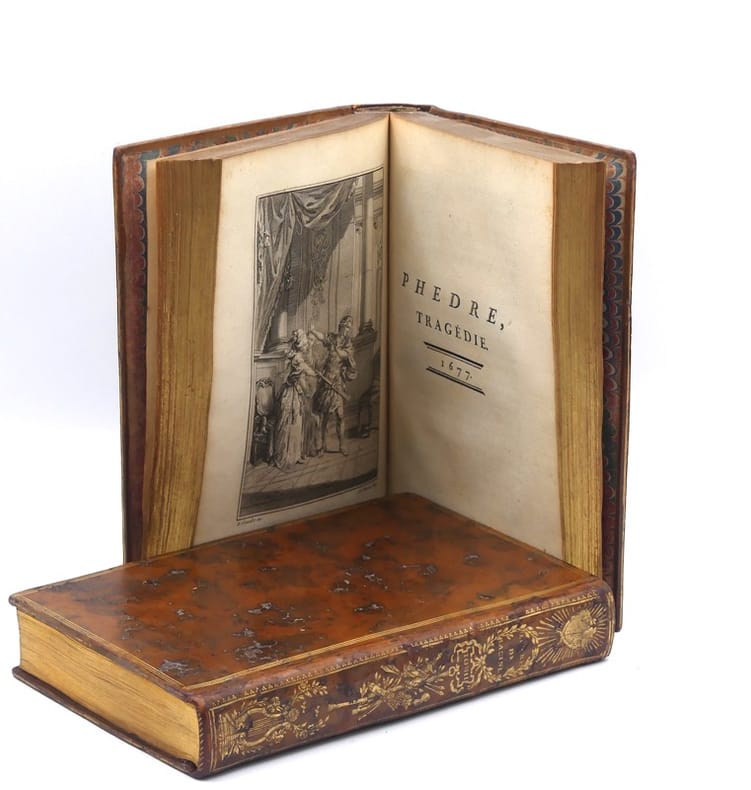 "Premier tirage. L’illustration comprend un portrait de Racine gravé par Gaucher, 12 figures hors texte de Gravelot, gravées par Duclos, Flipart, Lemire, et le portrait de Corneille d’après Le Brun. Gravelot, le vignettiste par excellence. Elève de Boucher, il excelle dans les scènes animées ou spirituelles. Son interprétation du théâtre racinien est autrement gracieuse que les figures un peu sèches et solennelles du peintre Le Brun. Les chastes et tendres créations d’Andromaque et d’Iphigénie, y gagnent une élégance coquette que Pons semble désavouer: ""Gravelot fait descendre la tragédie de la scène au boudoir."" C’est faire le procès du siècle de Louis XVqui détesta le style noble et les règles surannées. Au temps de Gravelot, le texte devenu prétexte à un art d’agrément, l’image n’avait plus à délivrer un enseignement. Dès lors, le théâtre de langue française, avant de pénétrer dans les salles de classe au siècle suivant, trouva place dans les cabinets d’amateurs pour autant que l’édition fût de luxe, le format maniable, l’illustration ""piquante"". Bel exemplaire dont les reliures sont ornées aux dos de fers spéciaux, dits fers de présent, spécialement dessinés par Gravelot. Cohen, Manuel de l'amateur de livres à gravures du XVIIIe siècle, 848. - Rahir, Bibliothèque de l’amateur, 602: ""Belle édition, d’un format commode et prisé par les amateurs. - Gordon N. Ray, The Art of the French illustrated book, 1982, 20. - Pons, Les Editions illustrées de Racine, 1878, 30-31."