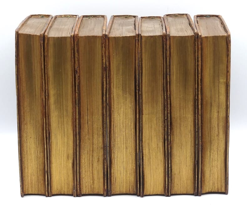 Paris, Louis Cellot, 1768. 7 volumes in-8 (194 x 126 mm), 4 ff. n. ch., CXLIV pp., 277 pp.; 2 ff. n. ch., 443 pp.; 2 ff. n. ch., 409 pp.; 2 ff. n. ch., 432 pp.; 2 ff. n. ch., 440 pp.; X pp., 437 pp; 2 ff. n. ch., 400 pp., 17 pp. Veau marbré, triple filet doré en encadrement sur les plats, dos lisse orné en long de motifs antiques, titre et tomaison dorés, coupes filetées, tranches dorées, quelques fines restaurations (reliure de l’époque).