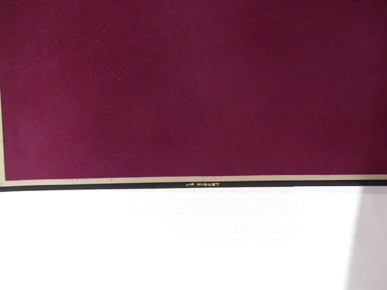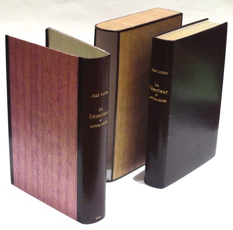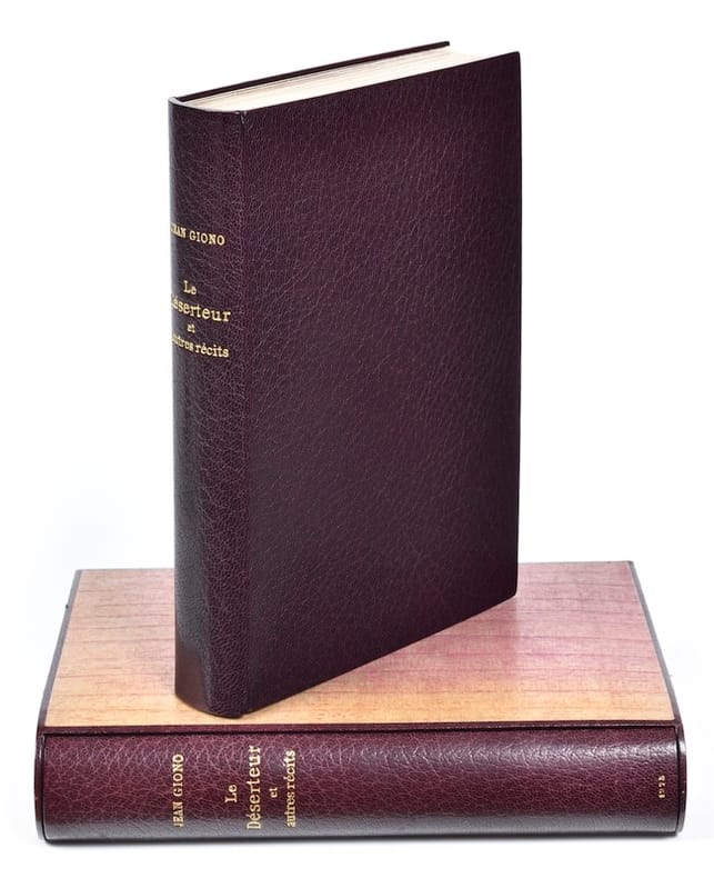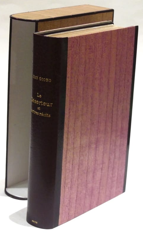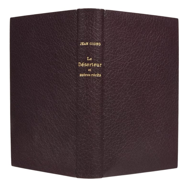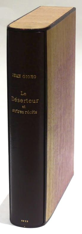Première édition collective, un des 37 exemplaires de tête sur papier de Hollande. La préface est d’Henri Fluchère. Ce recueil réunit un ensemble de quatre récits composés par Giono entre 1953 et 1966 - Le Déserteur, La Pierre, Arcadie…Arcadie… - et un essai autobiographique, Le Grand Théâtre. En apparence différents, ces quatre textes sont réunis par la même unité, celle de l’écriture personnelle du roman, s’exerçant successivement au récit imaginaire, au conte et à l’autobiographie. Abandonnant sa Provence natale pour le canton suisse du Valais, Giono composa dans Le Déserteur la biographie imaginaire du peintre Charles Frédéric Brun dont il rendit l’œuvre célèbre. "Peu de temps après il mourut" (Henri Fluchère). Publié pour la première fois en 1966, Le Déserteur fut un des derniers romans de Giono décédé en 1970. S’orientant vers le cinéma, l’écriture de scénarios et le théâtre à la fin de sa vie, Giono consacra moins de temps à l’écriture romanesque. Ses récits conservent pourtant toute l’expression du ton personnel et de la poésie propre à son style. Miguet, un maître de la reliure. Jean-Paul Miguet (Paris, 1925-Nantes, 2019) est l’un des meilleurs relieurs de la seconde moitié du XXe siècle. Élève de l’école Estienne, ouvrier de la Bibliothèque nationale (1944-1948), il s’établit à son compte avec sa femme Colette en 1951 et fut élu Meilleur ouvrier de France l’année suivante. "Défenseurs acharnés de la reliure de haute qualité au service du livre, ces deux artisans professent que le relieur ne doit jamais trahir l’auteur dans la conception du décor, ni, éventuellement, l’illustrateur, mais se doit de définir un graphisme et couleurs qui les interprètent au mieux, et ce, dans une grande perfection d’exécution" (Fléty). Parfait exemplaire en reliure triplé de Miguet. Fléty,Dictionnaire des relieurs français,p. 130.