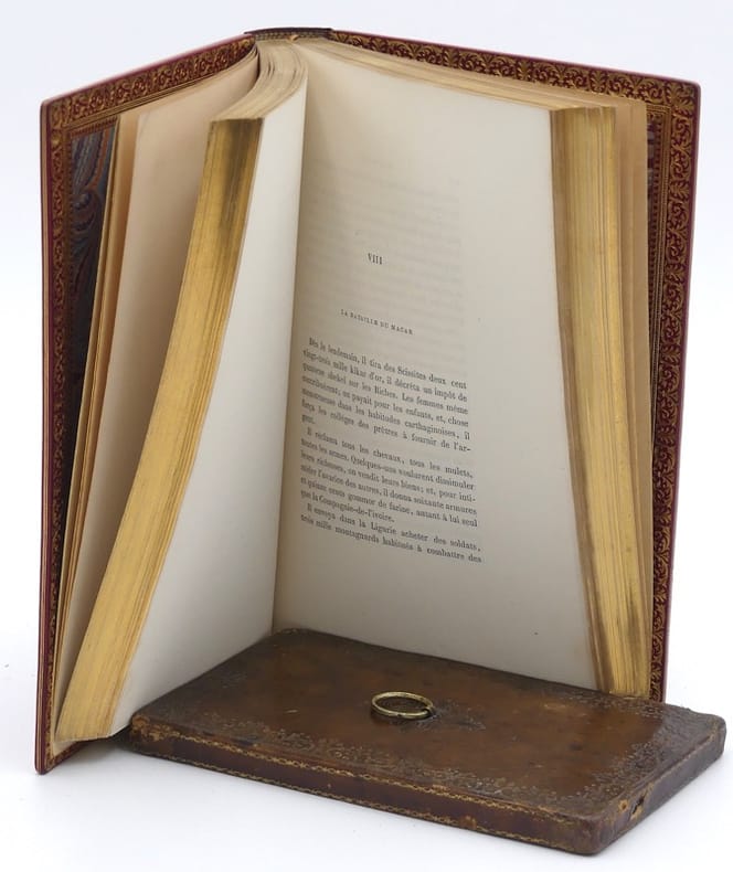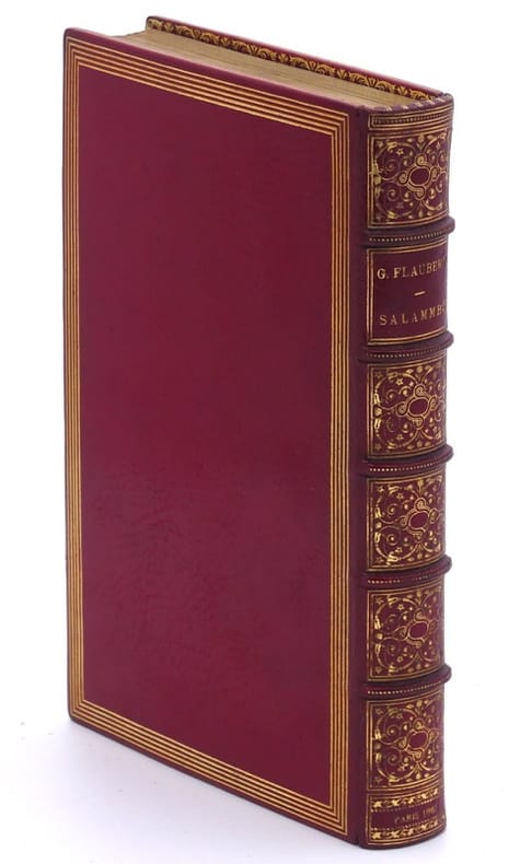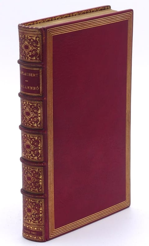 Édition originale. "Salammbô n'est pas une simple reconstitution historique, une minutieuse évocation ; c'est une œuvre vécue, écrite avec passion, toute animée d'un vaste souffle qui court d'un chapitre à l'autre jusqu'à la fin, c'est une vaste épopée, où ne manquent ni le pittoresque ni la chaleur. […] Tout le livre est soulevé par une violente passion qui lui confère une présence étonnante. Y contribue naturellement le style magnifique, parfois trop recherché, ce style qui fera école parmi les Parnassiens et les Symbolistes" (Laffont-Bompiani). Bel exemplaire en maroquin rouge de Champs. Carteret, Le Trésor du bibliophile romantique et moderne 1801-1875, I, p. 266. Clouzot, Guide du bibliophile français. XIXe siècle, p. 121. Vicaire, Manuel de l'amateur de livres du XIXe siècle, III, col. 934. Laffont-Bompiani, Dictionnaire des œuvres de tous les temps et de tous les pays, VI, p. 25.