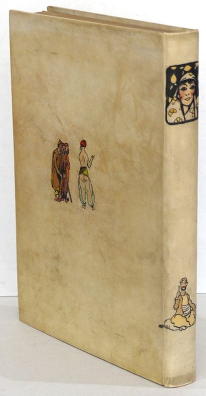 Paris, Kieffer, 1920. In-4 (275 x 200 mm), 135 pp., 3 ff. n. ch., 1. f. blanc. Vélin, auteur et titre calligraphiés à l’encre noire et dessin original en couleurs sur le premier plat reproduisant la couverture, petit dessin en couleurs sur le plat inférieur, dos lisse orné de deux autres dessins originaux reproduisant des illustrations de l’ouvrage, tête dorée, non rogné, couvertures et dos conservés (reliure de l’époque).