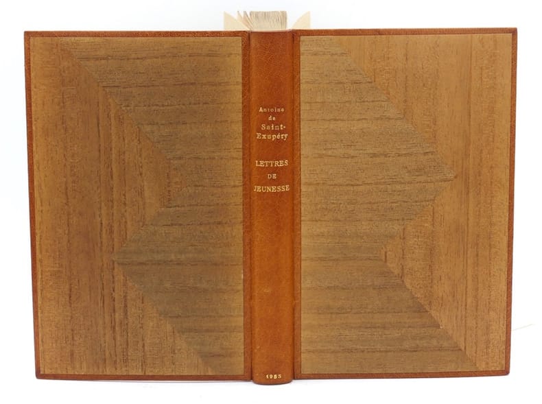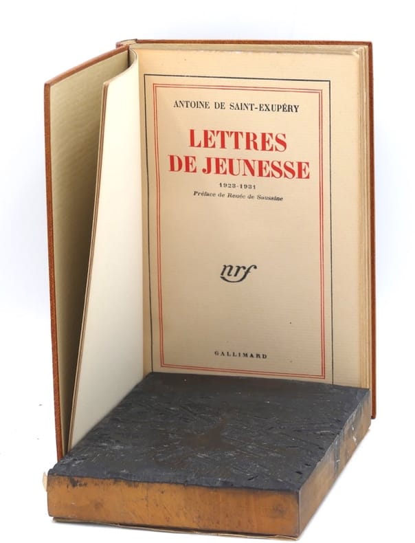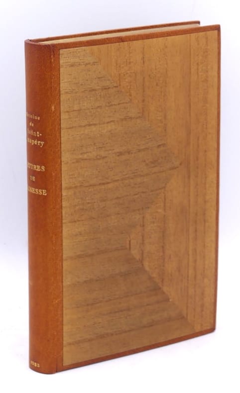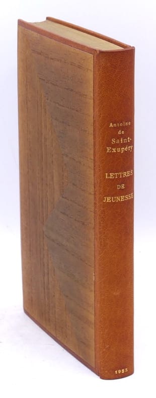 Edition originale, un des 60 exemplaires sur Hollande, second papier, celui-ci un des dix hors commerce.Cet ouvrage regroupe vingt-cinq lettres d’Antoine de Saint-Exupéry à son amie Renée de Saussine, "Rinette", écrites de 1923 à 1931."Elles reflètent neuf années de la vie du grand écrivain, neuf années de jeunesse, d'espoirs, neuf années d'action et de pensée intenses.Renée de Saussine a fait précéder ce recueil d'une préface, qui évoque, presque adolescent, l'auteur de Vol de nuit. Selon sa propre expression, elle fait revivre cette «époque de sensibilité d'ultra-son, de luttes souvent pathétiques. Plus tard, Antoine, aviateur, illustre écrivain, aura trouvé son unité, sa voie, sa gloire»" (Gallimard).Tres bel exemplaire relié par Jean Paul-Miguet en maroquin décoré de marqueterie.