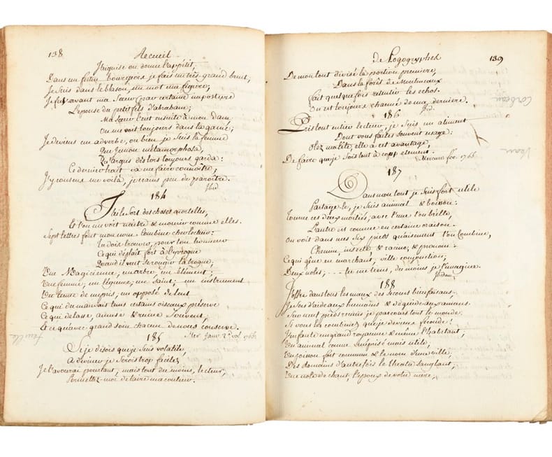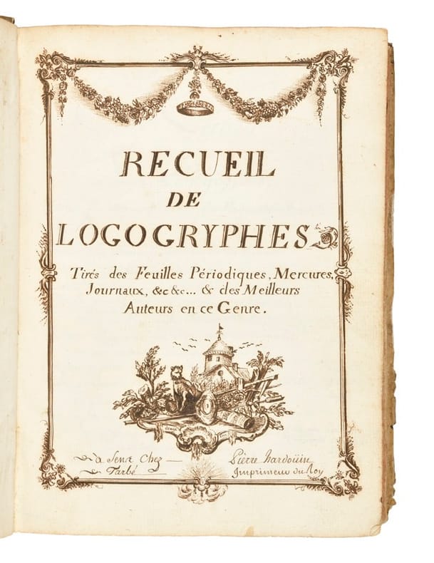 Ce manuscrit inédit mais destiné à l'impression, réunit 772 logogryphes.Ils ont été tirés des feuilles périodiques, Mercures, journaux et des meilleurs auteurs en ce genre. Jeu de l’esprit poétique, le logogryphe (ou logogriphe) apparut, pour la première fois, dans la revue française le Mercure de France en 1727. Suivant la définition du dictionnaire de Littré, ajoutée en note manuscrite dans la page précédent le titre du recueil, il s’agit d’une « sorte d'énigme dont le mot est tel que les lettres qui le composent puissent fournir plusieurs autres mots; on définit ces mots secondaires: et c'est par ces définitions qu'on s'efforce de deviner le mot du logogriphe ». Il devint le deuxième jeu littéraire, après l’énigme (vers 1679) qui rencontra immédiatement l’engouement des lecteurs. Parisiens et provinciaux envoyèrent régulièrement leurs logogryphes aux journaux pour alimenter leur rubrique de divertissements. Ainsi, le lecteur devint également contributeur du journal, l’un des plus célèbres fut Charles-Marie de La Condamine (Paris, 1701-1774), scientifique et membre de l’Académie française. Outil de fidélisation des lecteurs cette rubrique s’enrichit en 1780 de la charade. « Jusqu’en 1820, après un travail de sélection, le périodique [Mercure de France] publie les énigmes, logogriphes et charades qu’il reçoit, accompagnés parfois des réponses des lecteurs aux devinettes du numéro précédent » (Timothée Léchot). Amateur éclairé et passionné de logogryphes, Jean Le Rond d’Alembert (Paris, 1717 -1783), mathématicien et encyclopédiste, devina sur son lit de mort le logogryphe du Mercure et « Le sieur Pankou[c]ke [propriétaire du Mercure] triomphe de voir que son journal soit le dernier ouvrage qu’ait goûté le philosophe mourant » (Mémoires secrets, 6 novembre 1783 cités par Denis Reynaud). Si la plupart des logogryphes du recueil proviennent du Mercure, d’autres sont identifiés par la ville comme Verdun (p. 436), La Rochelle (p. 494), Montpellier (p. 497), Auxerre (p. 505), Sens (p. 507), Orléans (p. 515), ou sont des extraits de manuscrits (p. 519).La page de titre est décorée d’un dessin à l’encre de Chine signé Drege dans un encadrement orné de guirlandes. Il pourrait être l’emblème de l’imprimeur dont le nom figure en bas de page. Des petits culs de lampes illustrent certaines pages.De nombreuses résolutions ont été ajoutées dans la marge à l'envers au crayon à papier, mais les premières sont à l'encre de la main de l’auteur. L’ouvrage se termine par un index des logogryphes, complété par un catalogue alphabétique de logogriphes non résolus en latin et en français. Pierre-Hardouin Tarbé (Sens, 1728 – Paris, 1784), nommé imprimeur du roi, en 1763, à Sens, « fut un précurseur, puisqu'en un temps où la Presse était encore à l'état d'embryon, il créa, rédigea et édita le premier journal du département de l'Yonne ». Il publia l'Almanach historique de la ville, diocèse et bailliage de Sens, qu’il rédigea intégralement de 1763 à 1781. Son instruction et son implication dans la vie locale, lui valurent d’être nommé notamment Procureur de Ville de 1765 à 1767, Premier Consul en 1767, juge-consul en 1769, conseiller de la ville en 1773. Sa veuve et ses enfants lui succédèrent et l’on peut dire que « avec Pierre-Hardouin Tarbé commence la série qui se continua à Sens pendant plus de quatre-vingts ans des imprimeurs et des publicistes de ce nom » (Ernest Landry). L’un de ses fils, Charles-Hardouin, fut anobli en 1815 et fit une brillante carrière d’officier sous le nom de Tarbé de Saint-Hardouin.Aucun autre exemplaire de ce manuscrit n’est référencé dans les bibliothèques françaises et étrangères. Manuscrit unique et inédit sur ce divertissement littéraire passionnant en vogue au XVIIIe siècle.Timothée Léchot, Profils d’un lectorat : Enquête sur les signatures d’énigmes du Mercure de France (1724-1778), 2022. Denis Reynaud, Le dernier logogriphe de D’Alembert, 3 mars 2025. Ernest Landry, Les Tarbé Généalogie-biographie, Sens, 1902, p. 17-18.