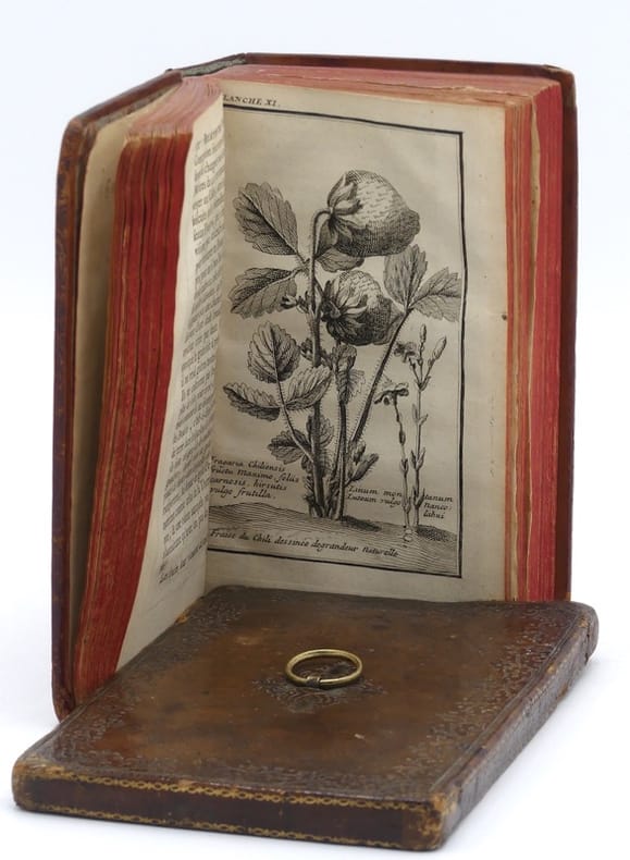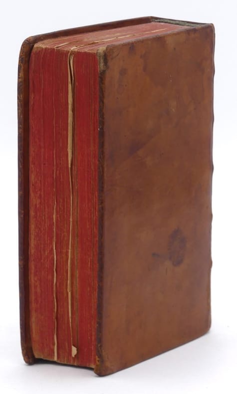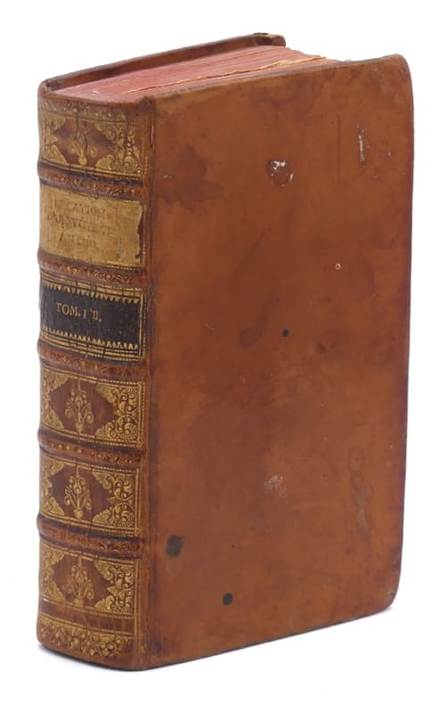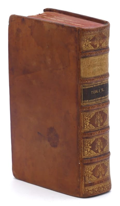 Amsterdam, Pierre Humbert, 1717. 2 tomes en un volume in-12 (160 x 99 mm), XX pp. y compris le frontispice, 600 pp., plus le frontispice répété et la page de titre du tome second. Veau blond, dos à nerfs orné, pièces de titre crème et brune, roulette à froid sur les coupes, tranches rouges, petites taches et marques d'usage sur les plats, un coin émoussé, des traces de mouillure marginale en gouttière, déchirure sans manque aux planches 1, 32 et page 595 (reliure de l'époque).