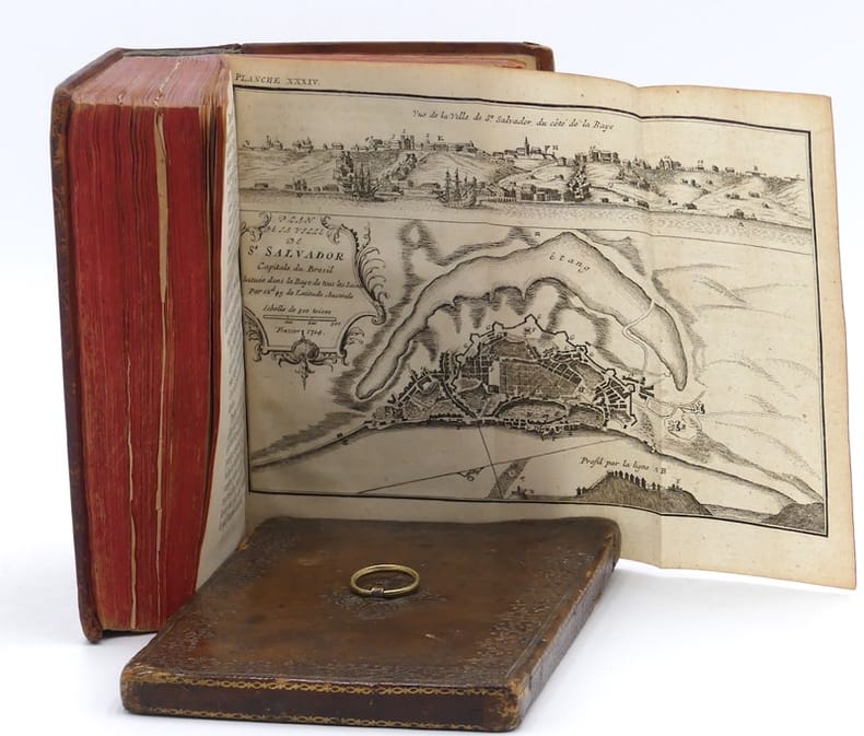 Amsterdam, Humbert 1717 2 tomes reliés en 1 fort volume in-12, veau granité, dos à nerfs ornés, XX- 294- pp 295 à 600 pagination continue pour les 2 tomes, frontispice et 37 cartes et planches, certaines dépliantes. Quelques mouillures claires sinon très bon exemplaire.