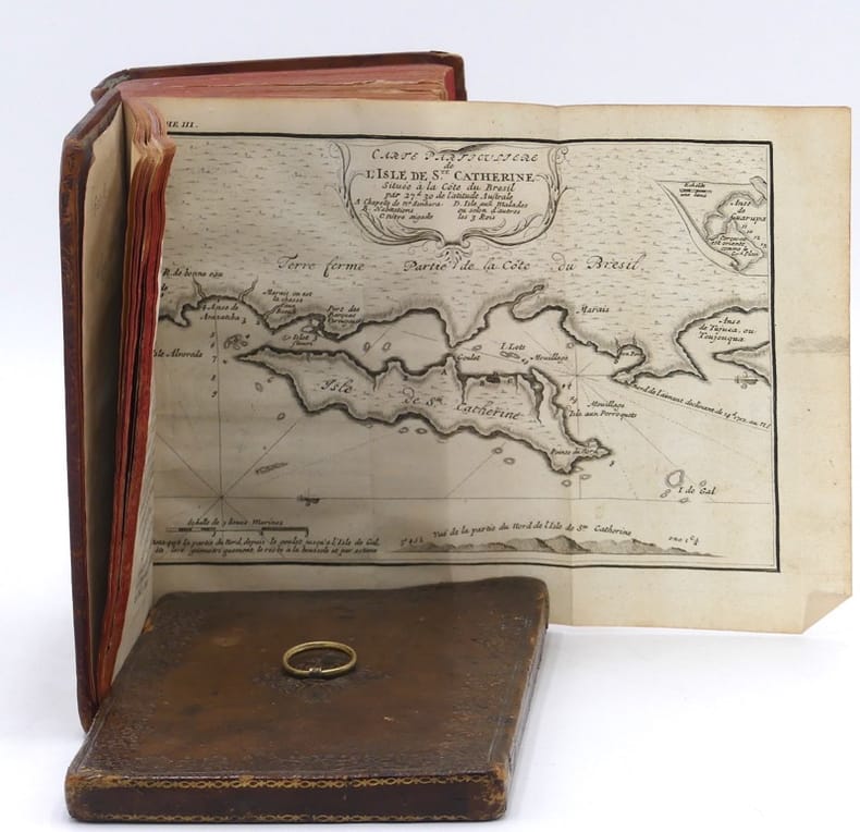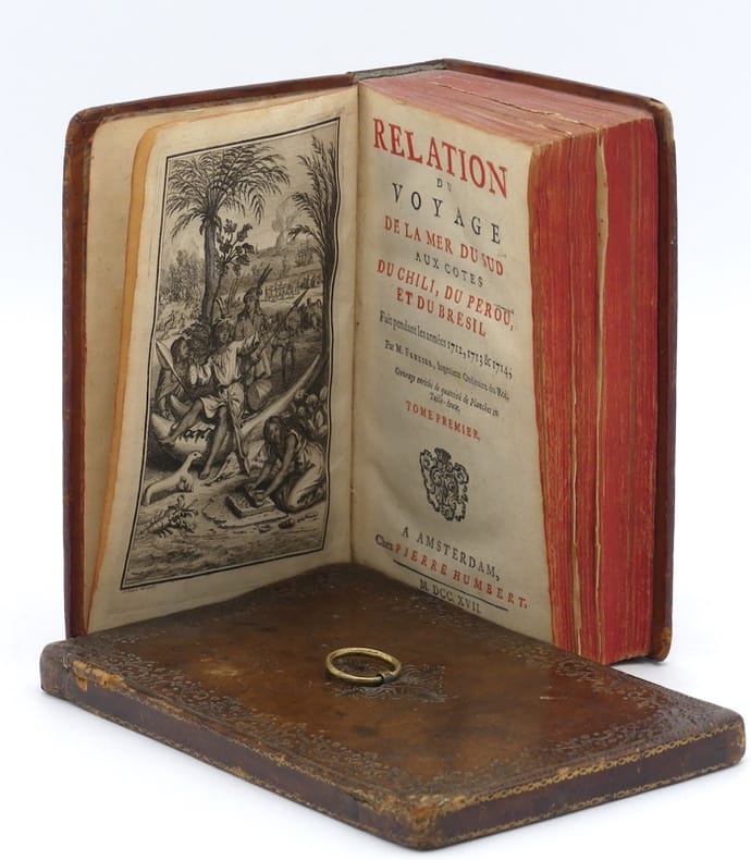 Édition publiée un an après l'originale. On a ajouté dans cette édition un curieux mémoire relatif aux missions du Paraguay, Mémoire touchant l'établissement des PP. Jésuites dans les Indes d'Espagne. Ce texte anonyme avait déjà été publié à Amsterdam en 1712.Cet ouvrage est illustré d'un frontispice de Bernard Picart, répété, et de 37 planches, dont 22 dépliantes, le tout gravé sur cuivre.Les planches représentent majoritairement des cartes, des plans de ville, dont certains avec vues, de l'histoire naturelle, avec notamment la célèbre fraise du Chili, et des scènes de moeurs."La relation de Frézier est d'une grande vérité ; et les nombreuses cartes qui l'ornent étant très-exactes, font rechercher ce livre" (Leclerc).Cette importante relation de voyage au Chili et au Pérou fit en outre progresser la topographie d'une partie des côtes (Terre De Feu, détroit de Lemaire et côtes patagonniennes...). Frézier a dressé la première carte précise de l'Amérique méridionale et donne une intéressante description physique, minéralogique et botanique. "Ouvrage très recherché. — L'auteur a touché au Brésil, il donne les plans de la Baie de tous les Saints et de l'île Ste Catherine" (Chadenat)."La description qu'il a faite du Chili est du plus grand intérêt ; soit parce que dans ses vallées ce pays est d'une telle fertilité que toutes les productions de l'Ancien et du Nouveau-Monde y prospèrent, soit parce que dans les montagnes et quelques unes même des plaines, il se trouve plusieurs nations qui ont su défendre opiniâtrement leur liberté contre les Espagnols" (Boucher de la Richarderie).Botaniste et ingénieur militaire, Amédée-François Frézier (Chambéry, 1682-Brest, 1773) fut chargé, au nom du Roi Louis XIV, d'aller espionner les ports, les relations commerciales, et les ressources minières des colonies espagnoles du Chili et du Pérou, sous couverture officielle de servir de conseiller militaire envers les Espagnols et les aider à se défendre contre les pirates. Il prit la mer en janvier 1712 et revint en France en août 1714. Il se révéla être un excellent explorateur, navigateur et cartographe.Bon exemplaire en veau blond de l'époque.Leclerc, Bibliotheca americana, 1878, n° 1738. Sabin, Dictionnary of books relating to America…, 25924. Bibliothèque de feu M. Ch. Chadenat, II, n° 4752, 5372. Boucher de la Richarderie, Bibliothèque universelle des voyages, VI, p. 327. Quérard, La France littéraire, III, p. 216.